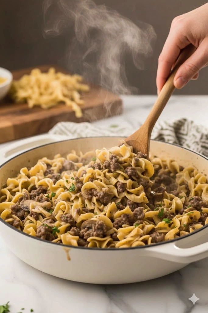 The final step requires careful handling. Remove the skillet completely from the heat source before adding the sour cream. If you add sour cream to a vigorously boiling or simmering liquid, it can separate, resulting in a grainy, curdled texture. A true 30-Minute Ground Beef Stroganoff should have a silken finish.