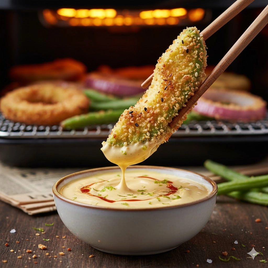 The zucchini should be sliced into uniform rounds. Zucchini has a high water content, so the flour dredging step is particularly important here to prevent the crust from becoming soggy. Perhaps the most interesting inclusion is the avocado. While many people only think of avocado as a cold ingredient, air-frying it in a tempura shell transforms it into a warm, decadent treat that mimics the texture of melted cheese or rich custard.