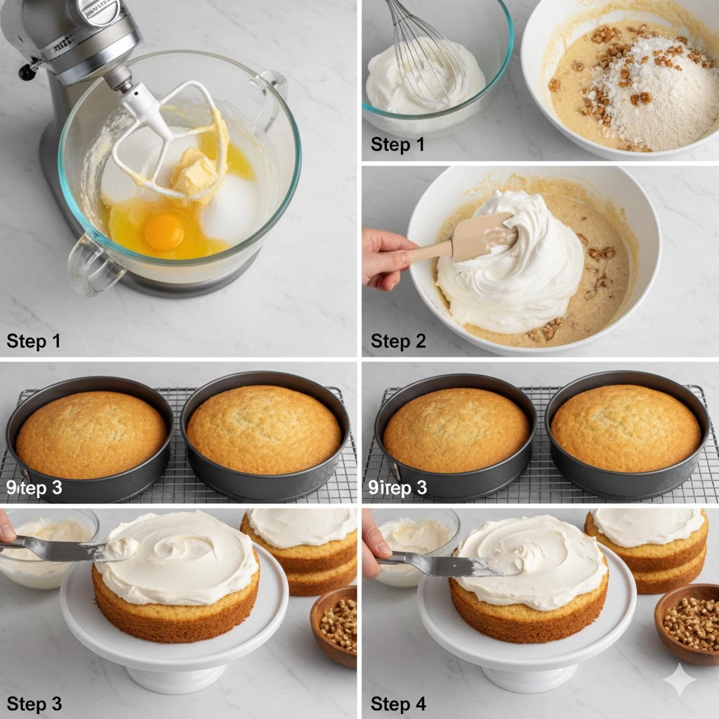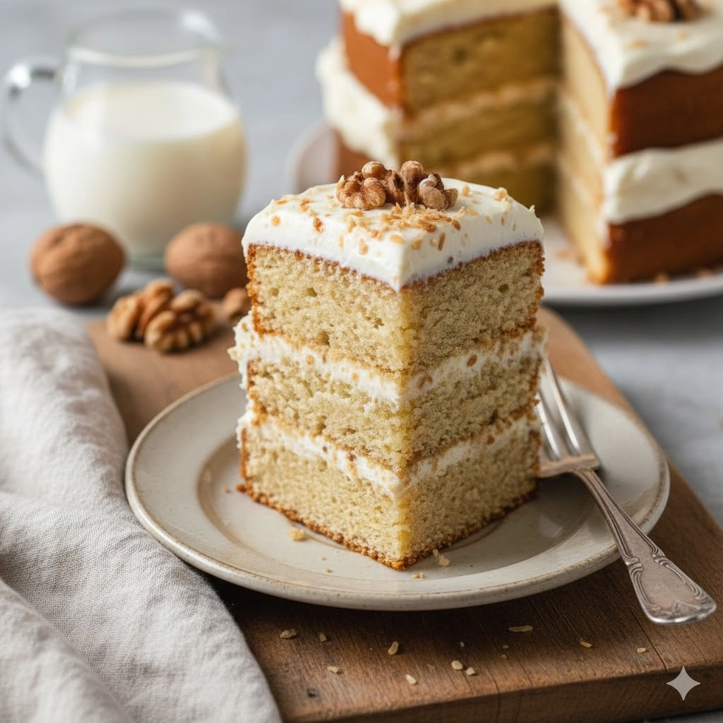 For a rustic, “naked” cake look, you can frost only the tops of the layers, leaving the sides exposed so guests can see the flecks of coconut and walnut within the crumb. If you prefer a traditional look, use an offset spatula to create smooth sides, then use a piping bag to create small rosettes of frosting around the top perimeter.