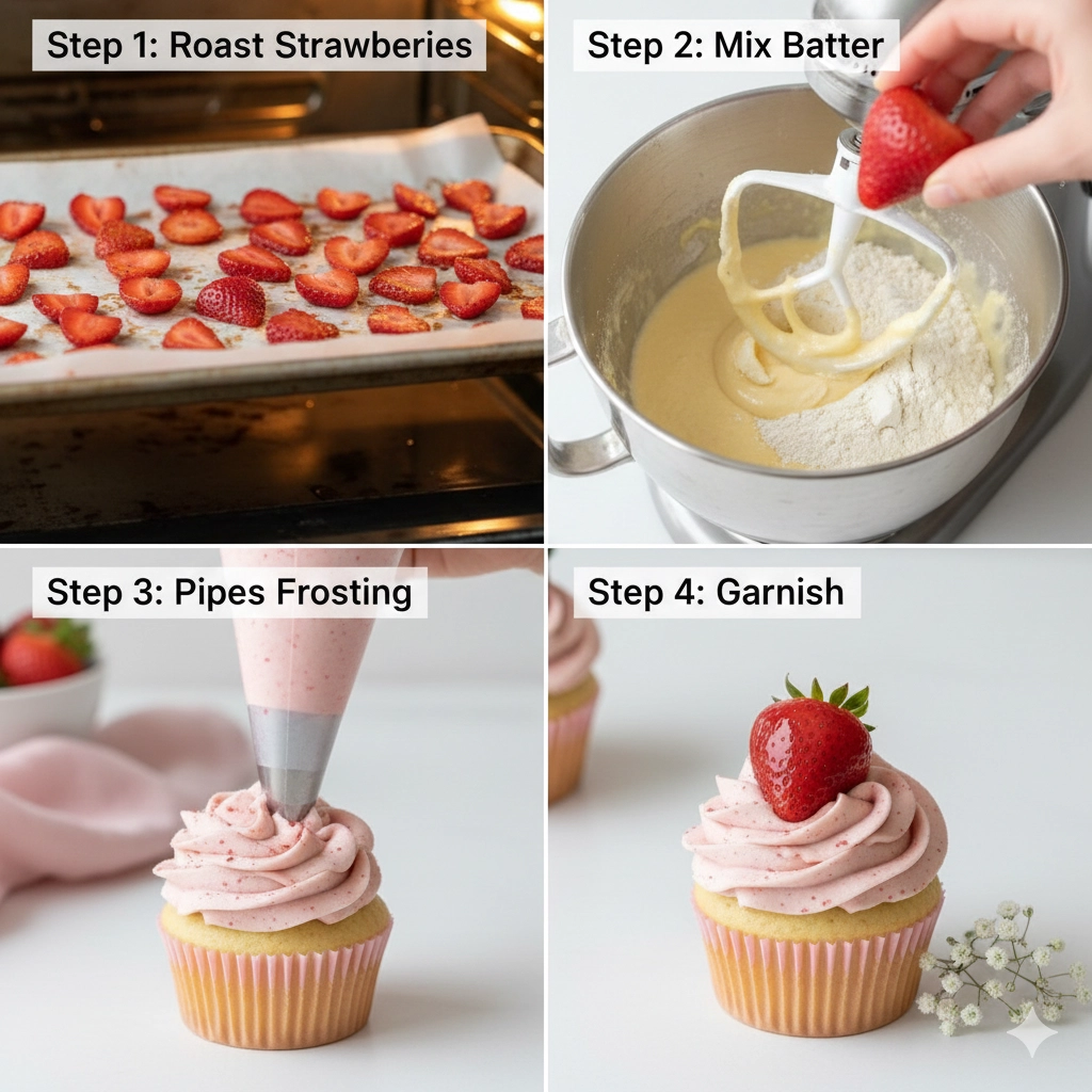 Blot the roasted strawberries thoroughly to prevent a soggy cupcake base.