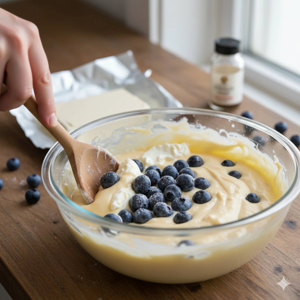 - Gently fold in the flour-coated fresh blueberries using a spatula, taking care not to crush the fruit.