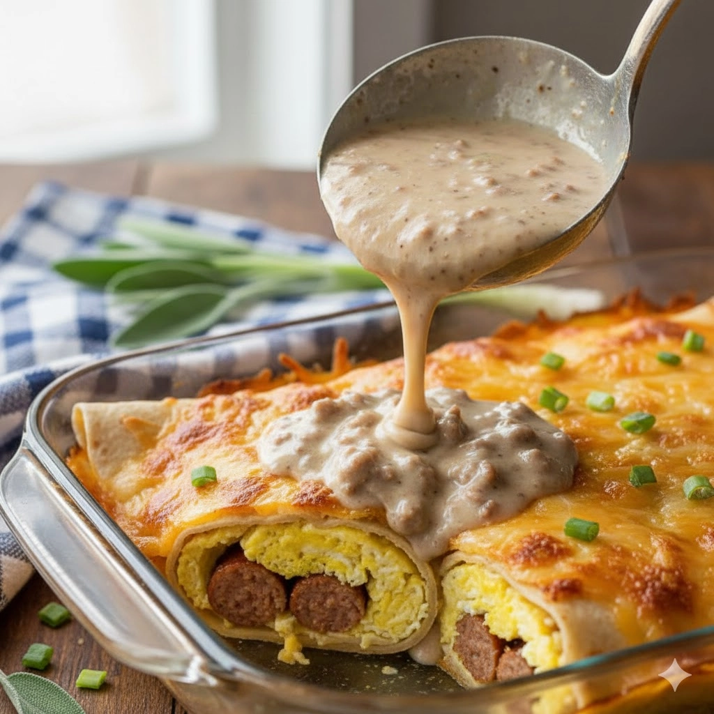 A comforting casserole dish featuring flour tortillas filled with scrambled eggs, sausage, and cheese, smothered in a rich, homemade sausage gravy, perfect for brunch or holidays.
