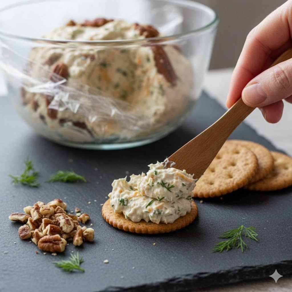 When you begin the shaping process, your hands are often the best tool. If the mixture feels too sticky, lightly dampen your palms with water. The five-minute chill time is a brief window that helps the fats stabilize, making it easier to achieve a round shape rather than an oval. As you roll the ball in the pecans, apply gentle pressure. You want the nuts to be embedded into the surface so they do not fall off when guests begin dipping. The aroma should be distinctly herbaceous, dominated by dill and garlic, while the texture remains firm enough to hold its shape at room temperature for several hours.