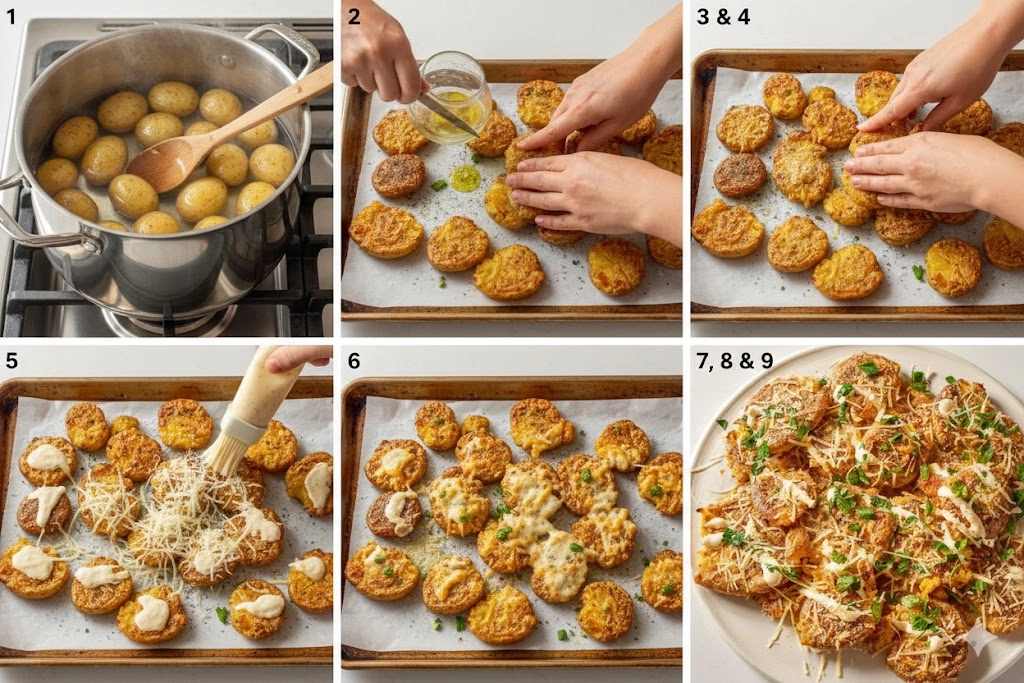 Ensure they are just fork-tender, not mushy. If they are overcooked, they will turn into mashed potatoes on the tray. If they are undercooked, they will resist smashing and may crack into large, dry pieces.