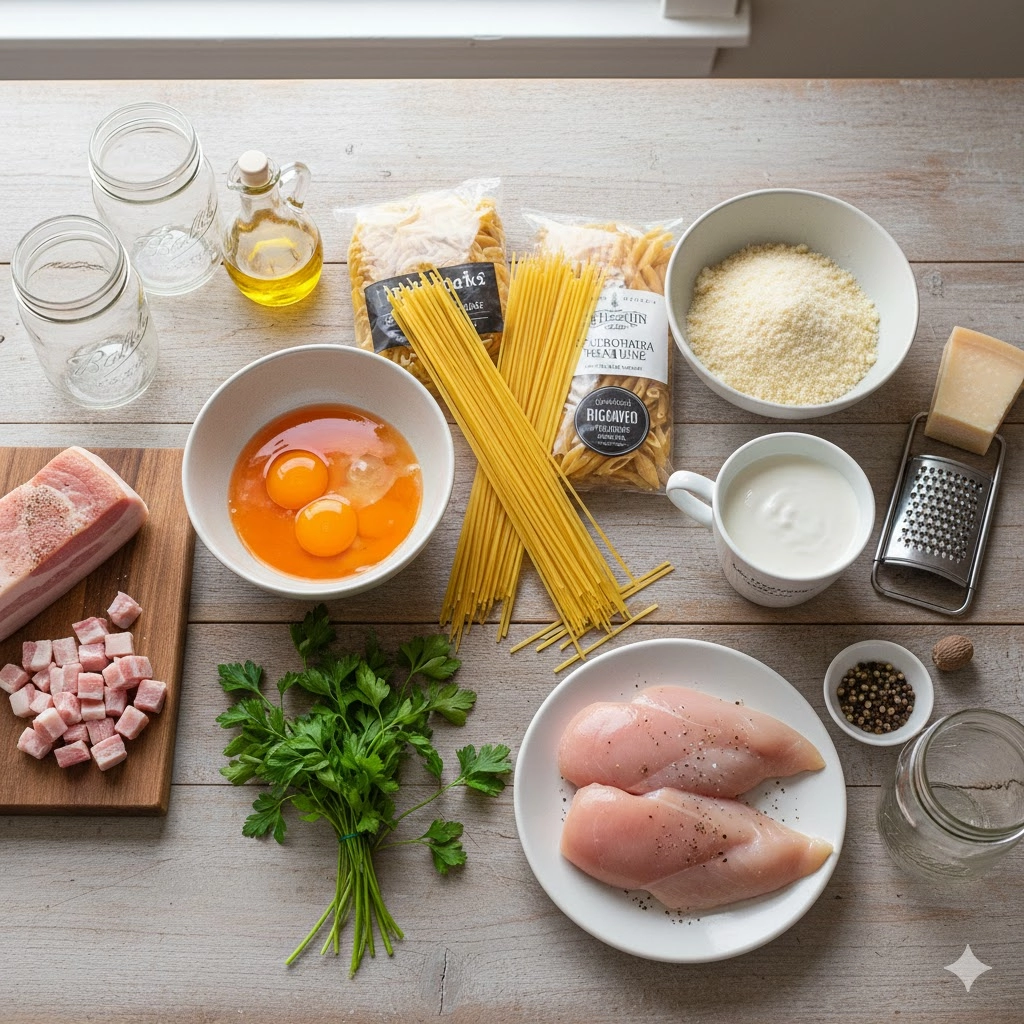 While you technically can use Alfredo, it will result in a completely different dish—a creamy chicken pasta bake, not carbonara. Carbonara relies on the specific, savory depth imparted by the egg yolks, cheese, and rendered pork fat working together to create a light, silky emulsion that no jarred white sauce can replicate.