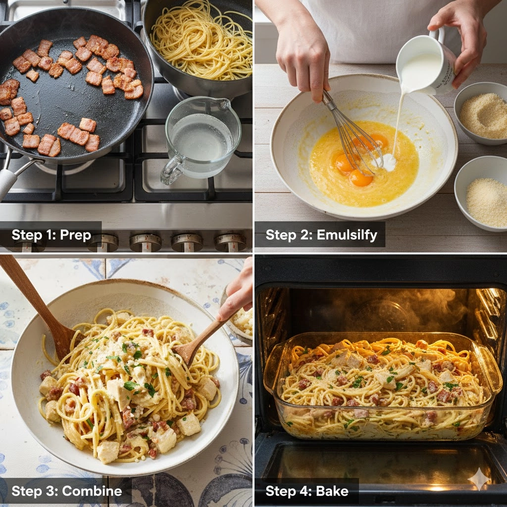 This recipe is structured into three main phases: rendering the pork and cooking the pasta, creating the delicate carbonara emulsion, and finally, baking the finished casserole. Following these high-level steps ensures a smooth process.