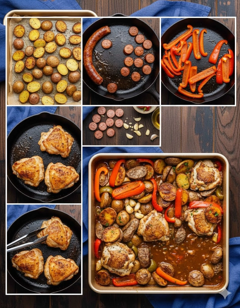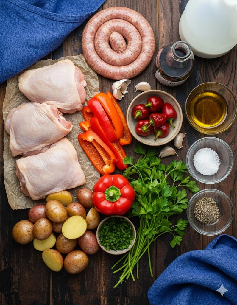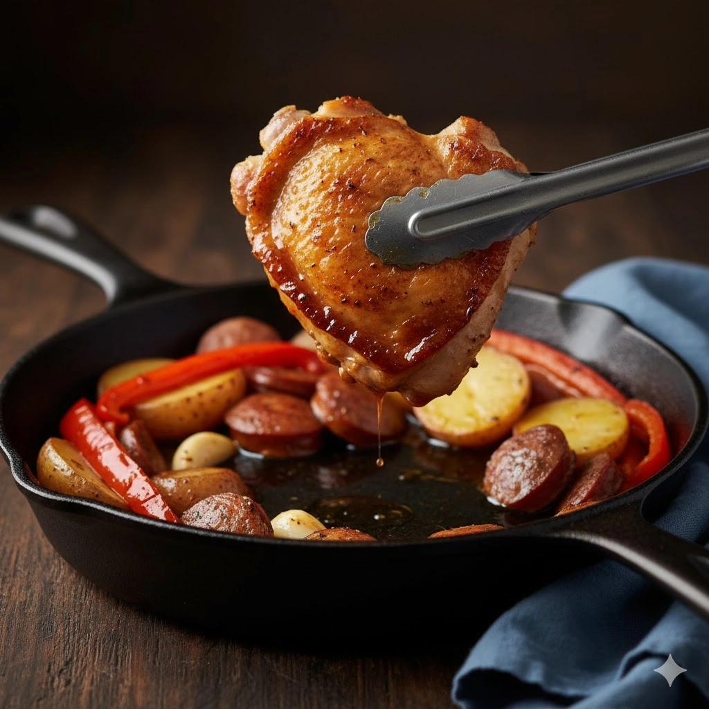 A bold Italian-American classic featuring crispy chicken thighs, savory beef sausage, roasted potatoes, and sweet-hot peppers in a tangy vinegar reduction.
