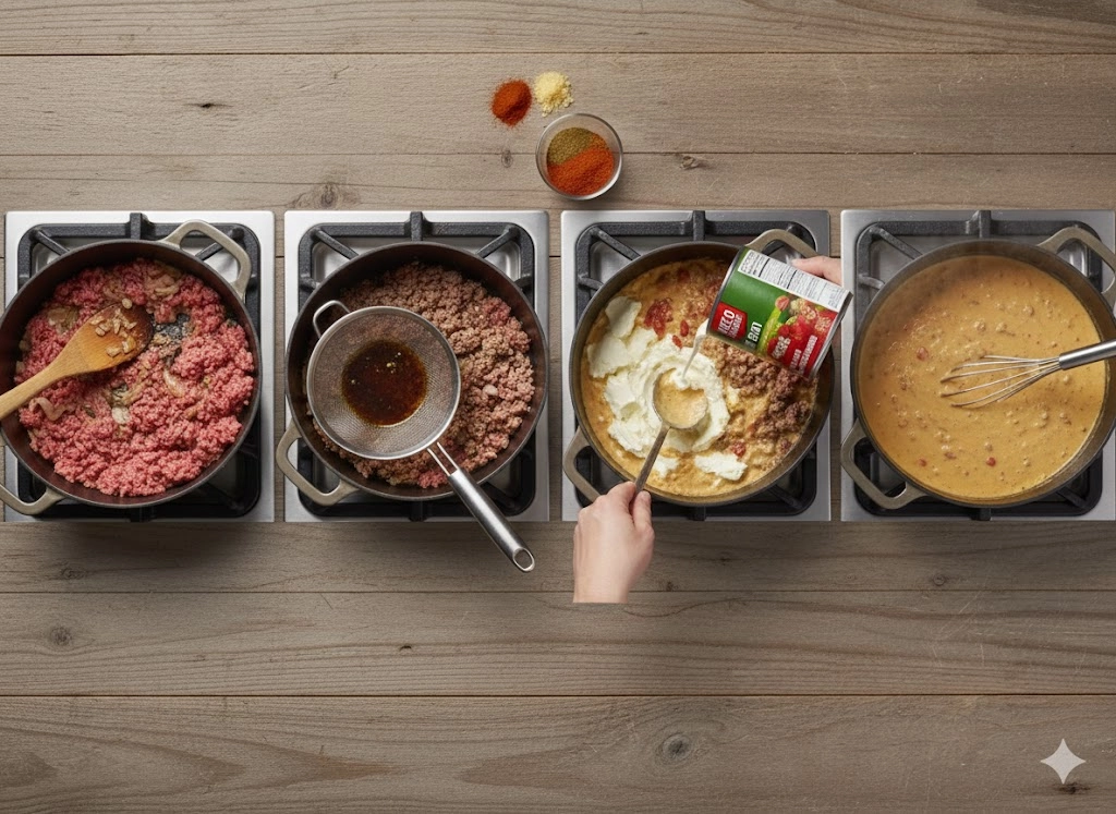 - Add the softened cream cheese in small chunks, stirring and mashing it into the beef mixture until it is completely melted and integrated.