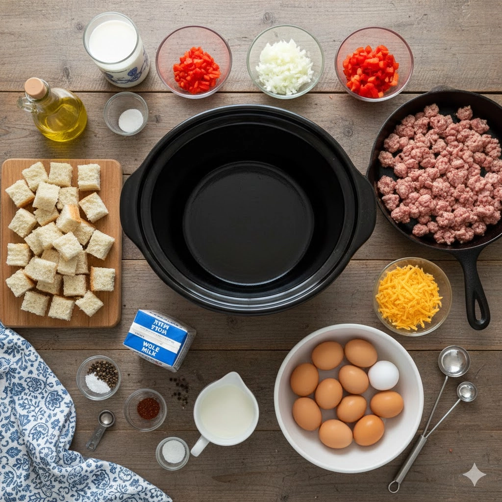 - Assemble the Foundation: Place the bread cubes into the bottom of the slow cooker in an even layer. Evenly scatter the cooked sausage, the softened vegetables, and the grated cheddar cheese over the bread.