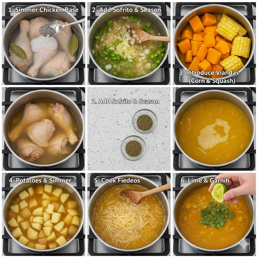 The “viandas,” or starchy vegetables, should be added in stages. The corn and carrots are resilient and can withstand the full cooking time. The squash, however, is the “thickener.” As it softens, a small portion of it will dissolve into the broth, turning it a rich, sun-kissed yellow. The potatoes should be added last so they retain sharp edges and a creamy interior.