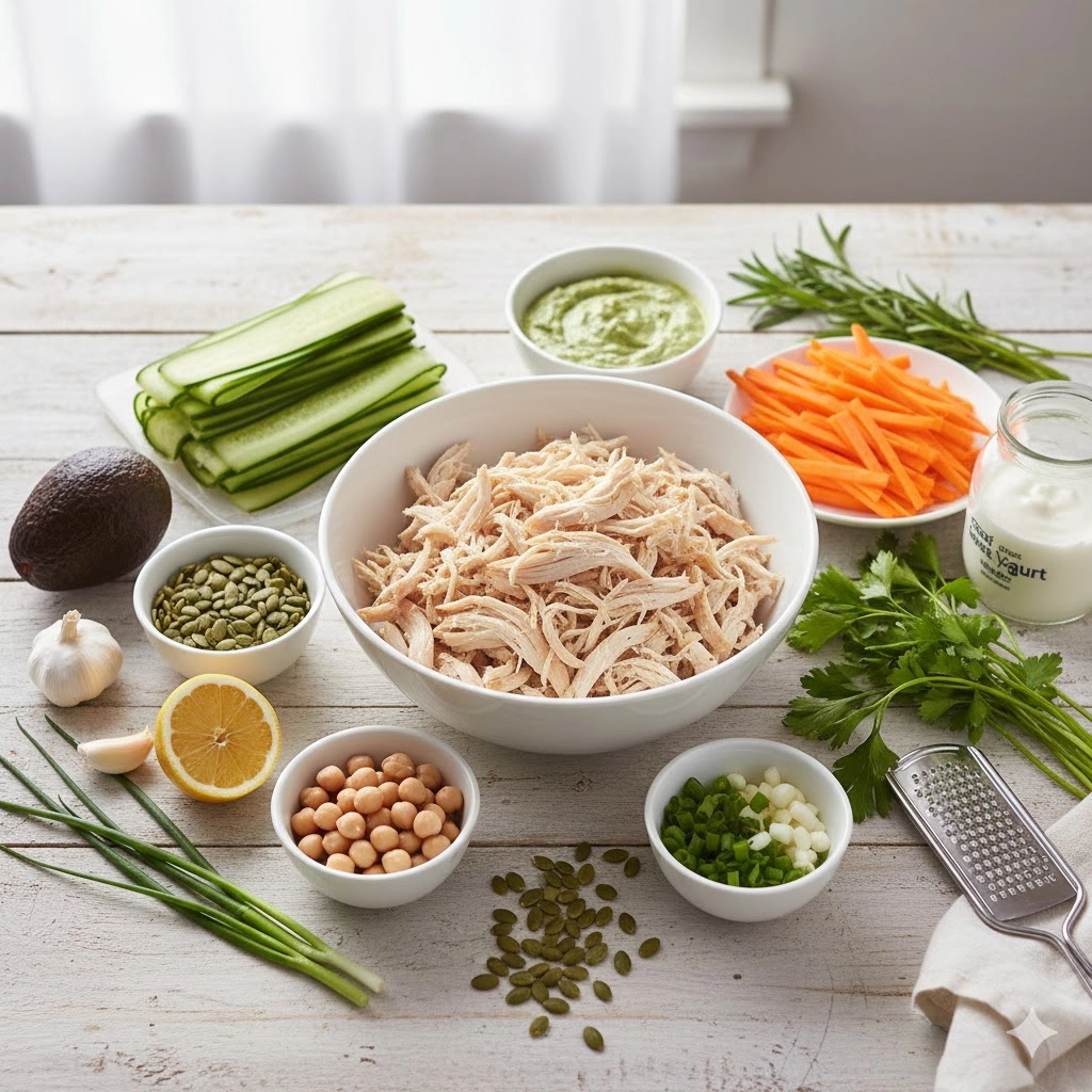 If you wish to omit the poultry, double the amount of chickpeas and add diced firm tofu that has been marinated in lemon and garlic. The texture remains substantial, and the Green Goddess dressing provides all the necessary richness.