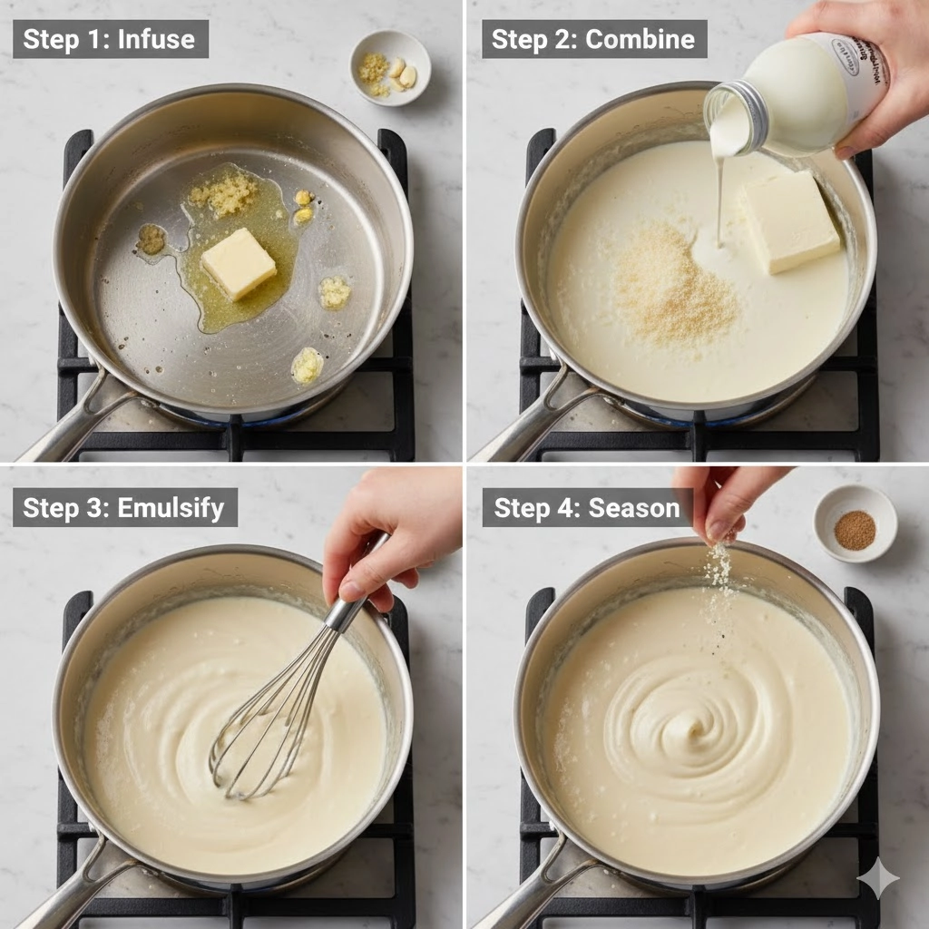 - Emulsify the Cheese: Whisk in the Parmesan cheese gradually, maintaining a constant stir until the mixture is uniform.