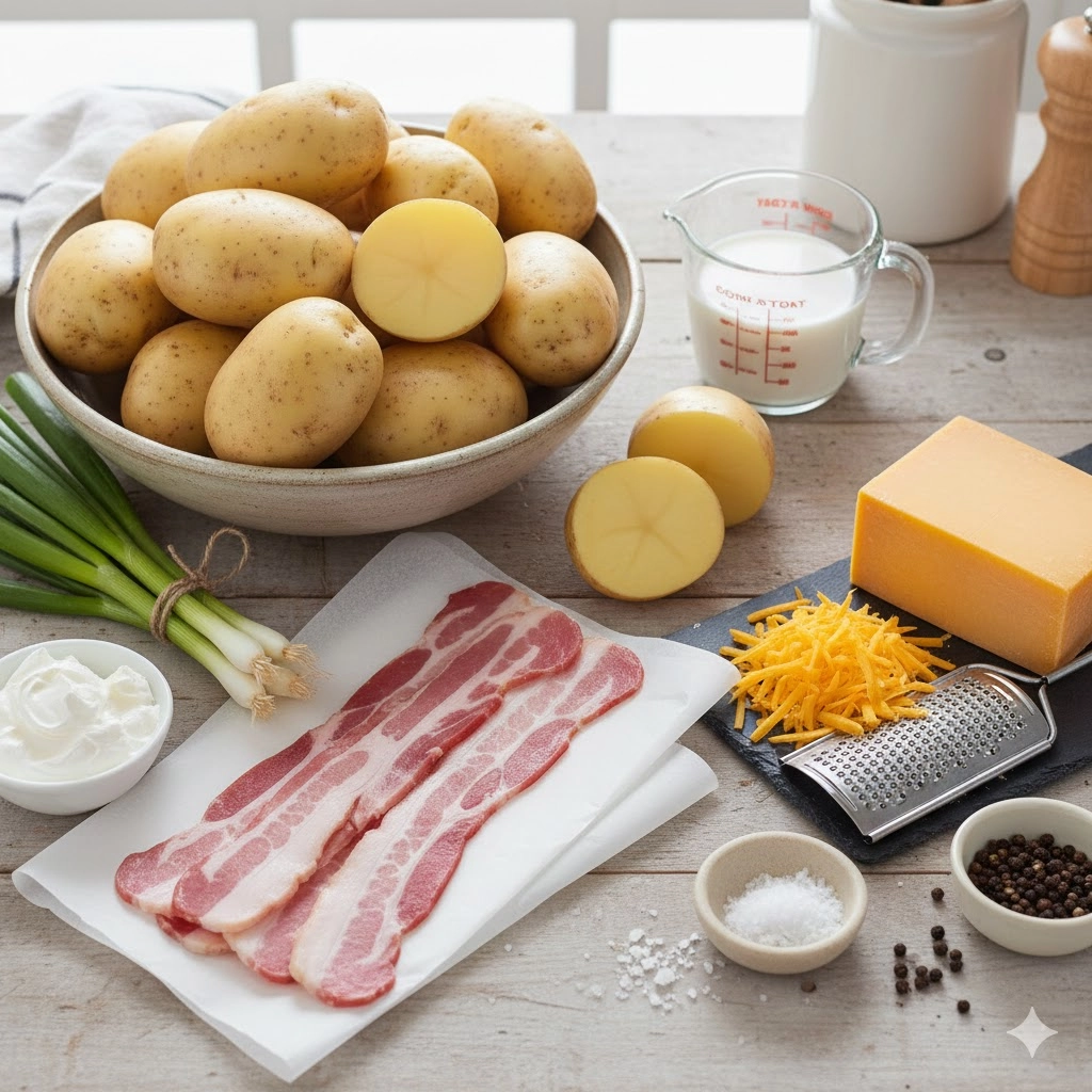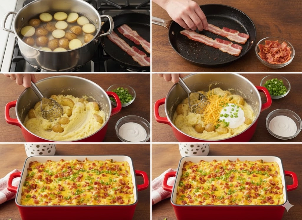 This Easy Loaded Baked Potato Casserole combines creamy Yukon Gold potatoes with crisp bacon, sharp cheddar, and fresh green onions for the ultimate crowd-pleasing side dish.