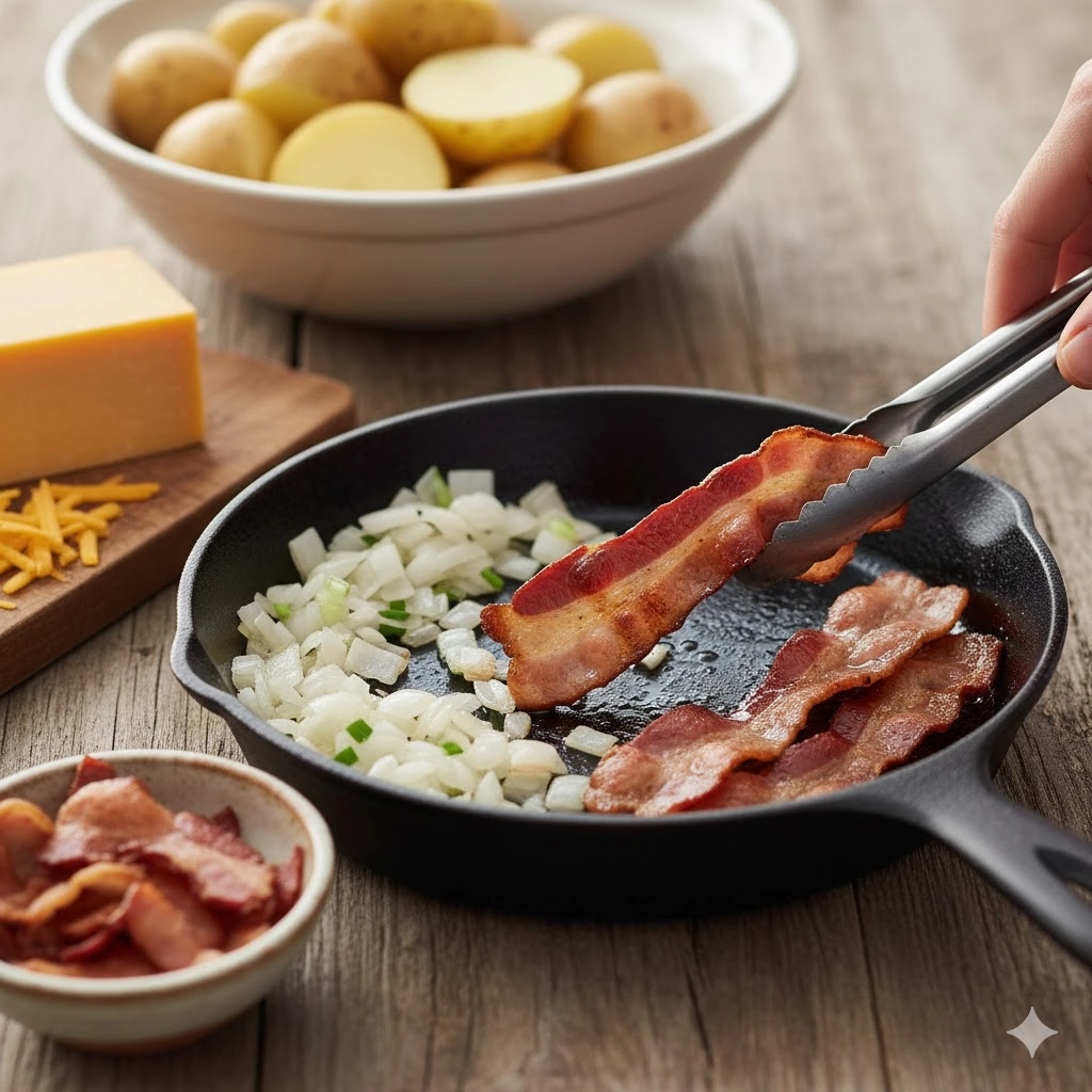- Bacon Texture: Cook your bacon until it is just slightly past the point of “chewy.” Since it will sit atop a moist potato bed in the oven, it needs to be quite crisp to maintain its texture.