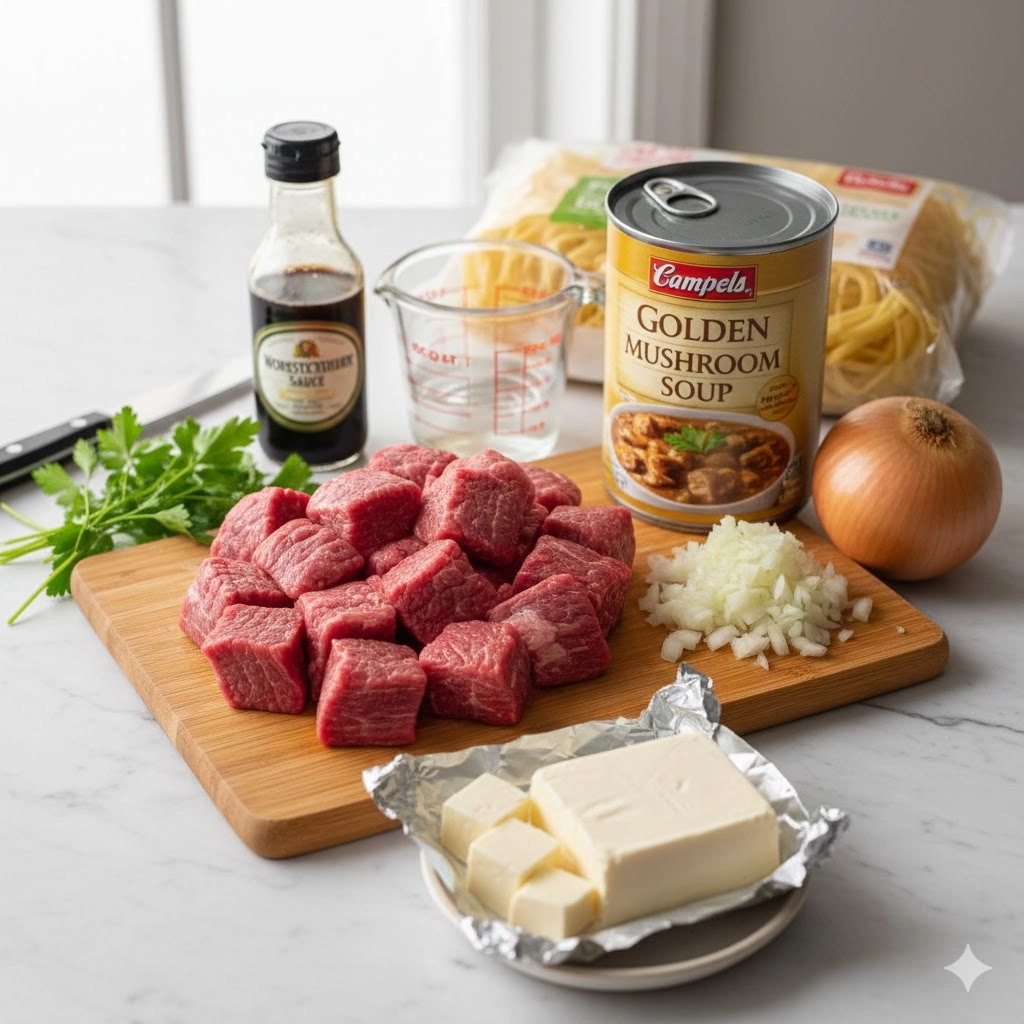 Begin by ensuring your beef cubes are roughly uniform in size. This ensures they cook at the same rate. When you add the onion and golden mushroom soup, you are creating a concentrated flavor base. Unlike standard cream of mushroom, golden mushroom soup contains a beef stock base which provides a deeper color and more savory profile. The addition of Worcestershire sauce introduces a necessary acidity and saltiness that balances the richness of the canned soup.