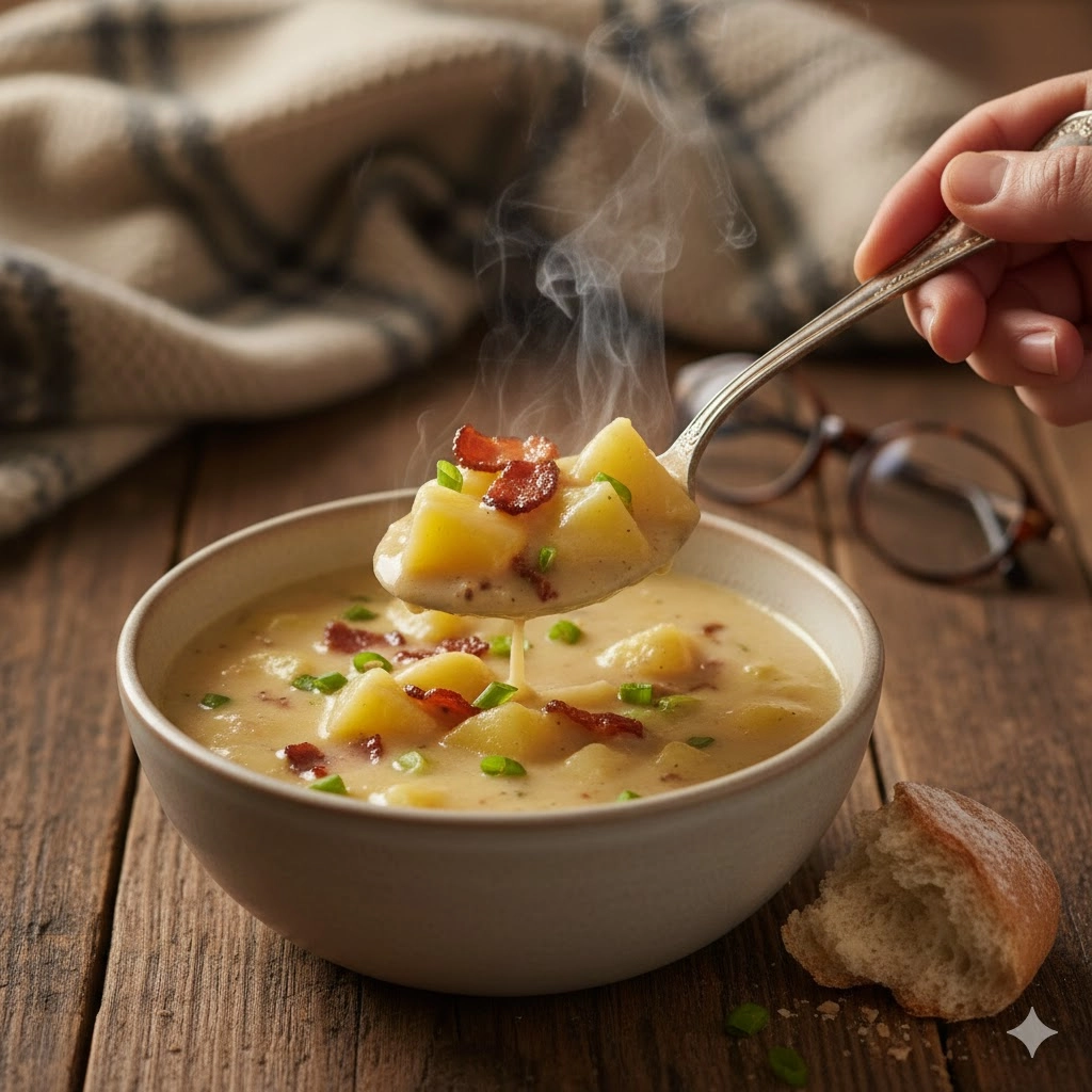 Presentation is the final touch that makes a meal feel special. This soup is a “blank canvas” for toppings. A classic “loaded” potato soup approach includes a generous sprinkle of extra sharp cheddar, a pile of crispy bacon bits, and a handful of fresh chives or scallions. The green onions provide a necessary bite and freshness that contrasts beautifully with the cooked onions inside the soup.