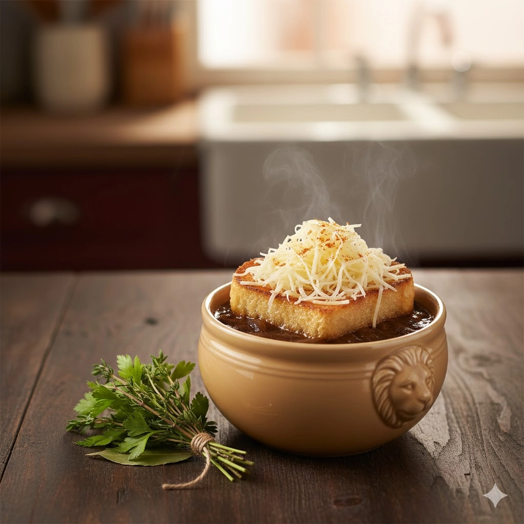 Finally, the assembly phase is where the “gratinée” happens. Filling the bowls only two thirds full is a practical tip; it leaves enough room for the bread to float without the soup overflowing immediately. When you lay the cheese on, try to make sure it covers the edges of the bread and touches the sides of the crock. This is what allows the cheese to “anchor” itself to the bowl, creating that satisfying crust that you have to break through with your spoon.