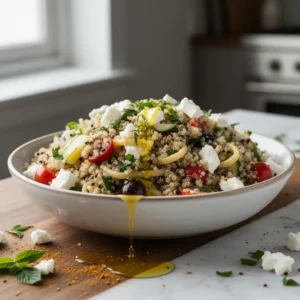 This vibrant salad bursts with fresh Mediterranean flavors, offering a delightful crunch from the vegetables and a creamy finish from the feta. It’s a healthy and delicious crowd-pleaser!