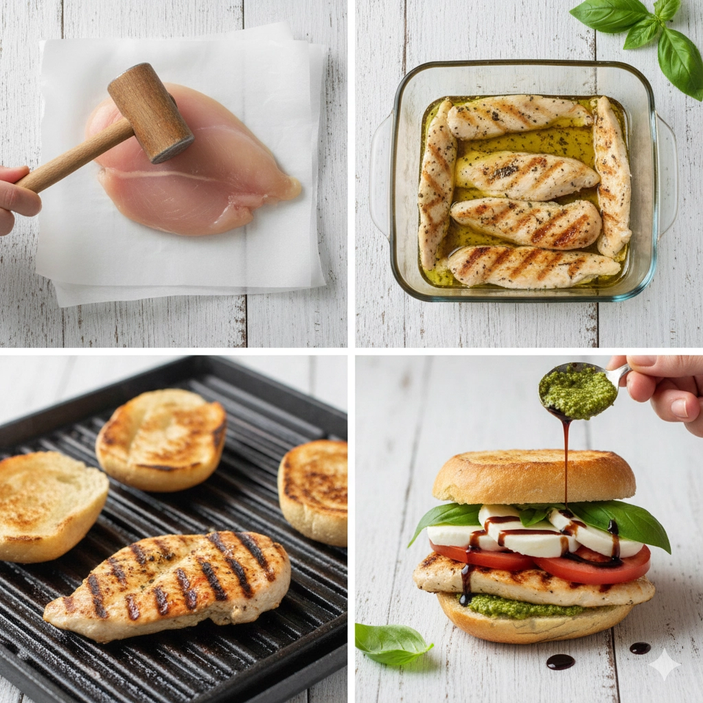 Yes, you can certainly prep the components in advance. You can marinate the chicken up to 8 hours before cooking and slice the mozzarella and tomatoes an hour or two ahead of time. However, for the best texture, I recommend grilling the chicken and toasting the bread just before serving. If you must cook the chicken early, reheat it in a 400 Fahrenheit oven for 10 minutes before assembling.
