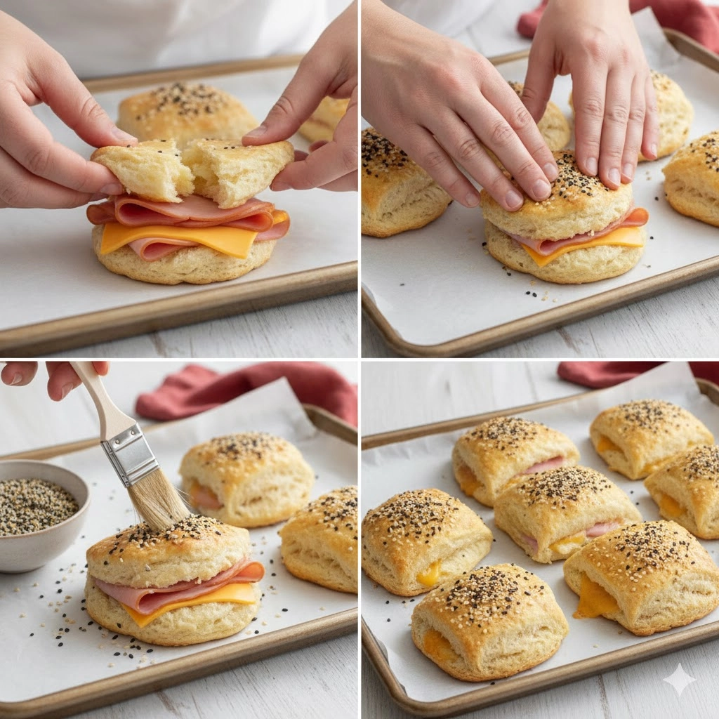 You can assemble the biscuits and keep them covered in the refrigerator for up to four hours before baking. However, for the best rise, it is recommended to bake them immediately after stuffing so the dough doesn’t absorb too much moisture from the ham.
