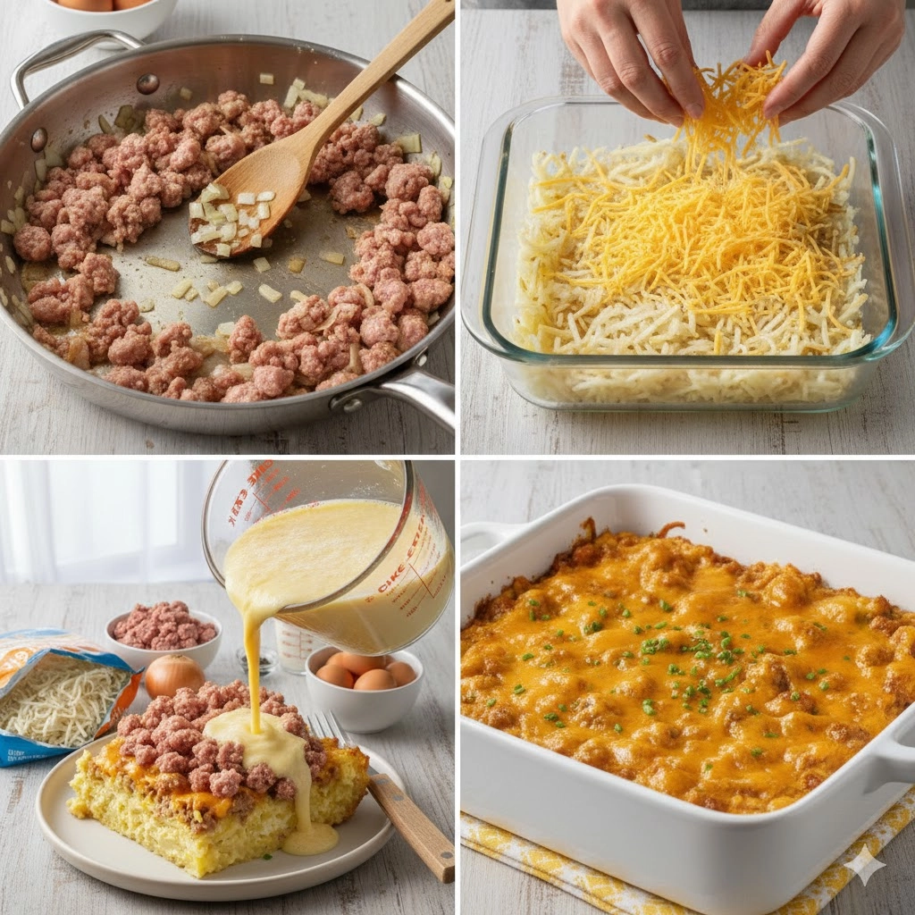 - Add the Sausage Layer: Distribute the cooked, drained sausage and onion mixture evenly over the top of the liquid custard layer. Finish by scattering the remaining half of the Cheddar cheese on top.