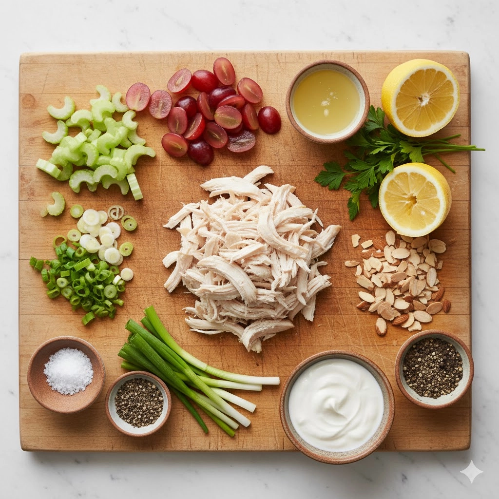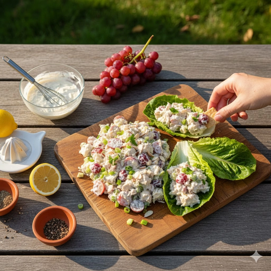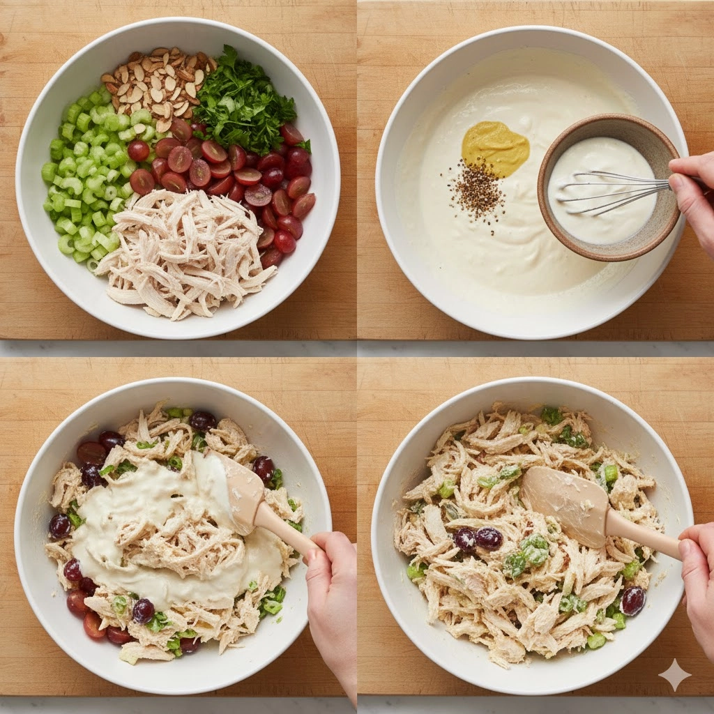 - Manage the Grapes: If your grapes are very large, quarter them. You want the fruit to be roughly the same size as the chicken pieces so the salad is easy to eat with a fork or on a cracker.