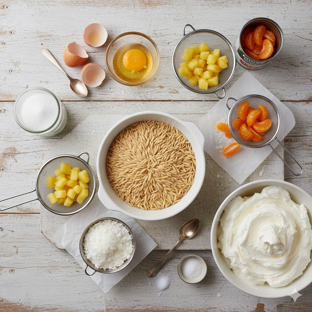 The custard dressing is the soul of this dish. Unlike modern versions that might use instant pudding mix, this cooked dressing uses the acidity of the pineapple juice to temper the richness of the eggs. When you are whisking the sugar, eggs, and flour, do not rush the process. Applying steady, medium heat is the best way to prevent the eggs from scrambling. You are looking for a transformation where the translucent juice turns into an opaque, golden cream. This dressing acts as a preservative and a flavor enhancer, soaking into the orzo while it rests in the refrigerator overnight. That eight-hour resting period is not a suggestion; it is the time required for the starch in the pasta to bond with the sugar and citrus notes.