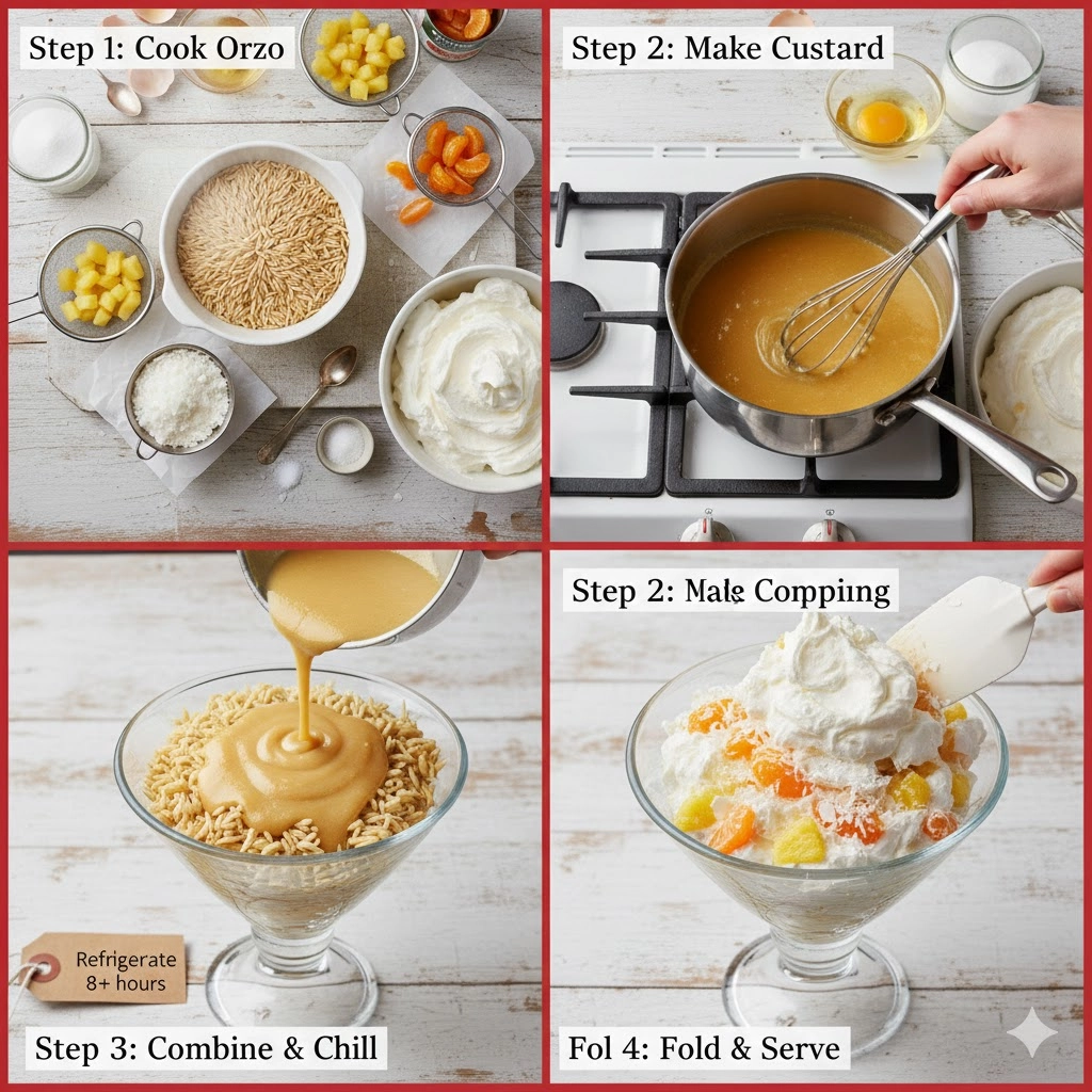 - Immediately pour the hot custard over the cooled orzo pasta. Toss the mixture gently to ensure every single grain of pasta is evenly coated in the sweet dressing. Cover the bowl tightly with plastic wrap and place it in the refrigerator. Let this base chill and marinate overnight, or for a minimum of 8 hours, to allow the flavors to fuse and the pasta to absorb the sweetness.