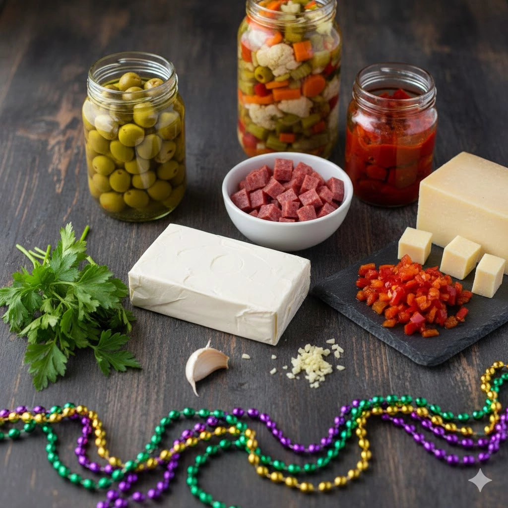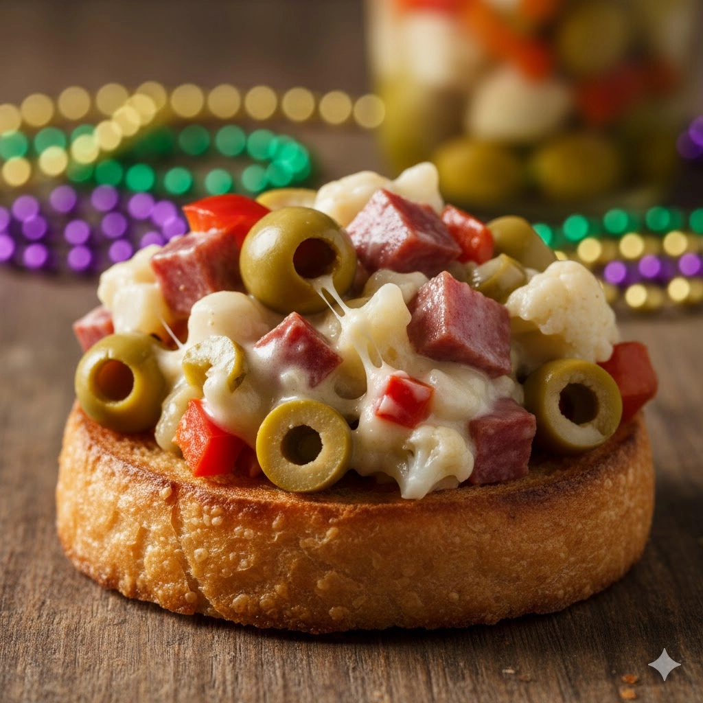 A warm and zesty appetizer inspired by the famous New Orleans sandwich, featuring cream cheese, savory salami, and a spicy Italian olive salad mix.