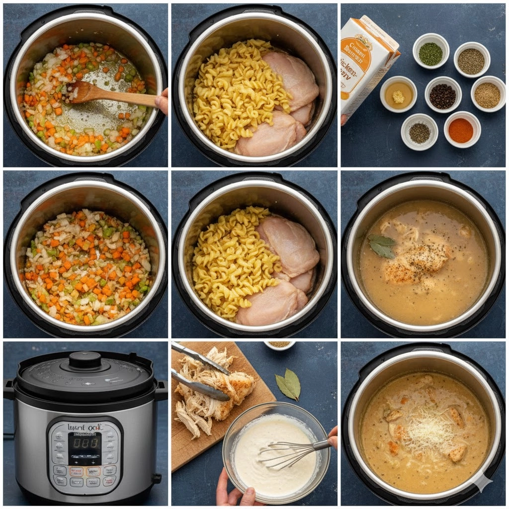 This Instant Pot Creamy Chicken Noodle Soup is a rich, one-pot meal featuring frozen egg noodles, tender chicken thighs, and a velvety parmesan cream sauce.
