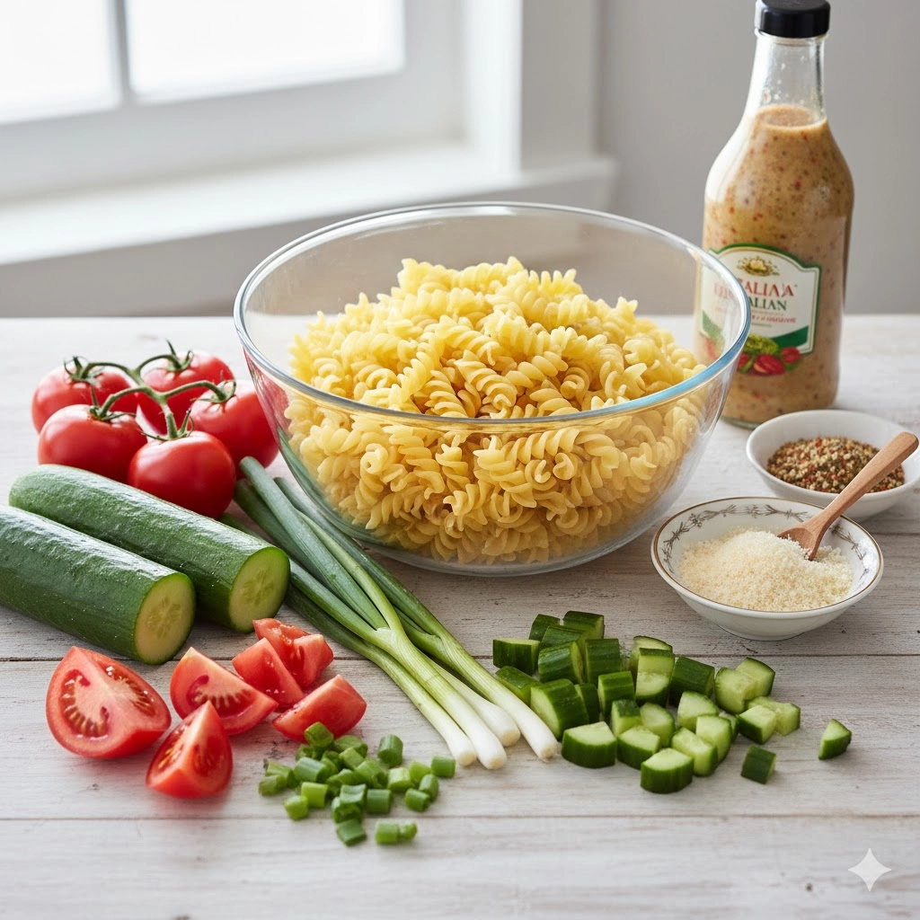 2. In a large bowl, toss the cooked pasta with the Italian dressing, chopped cucumbers, tomatoes, and green onions.