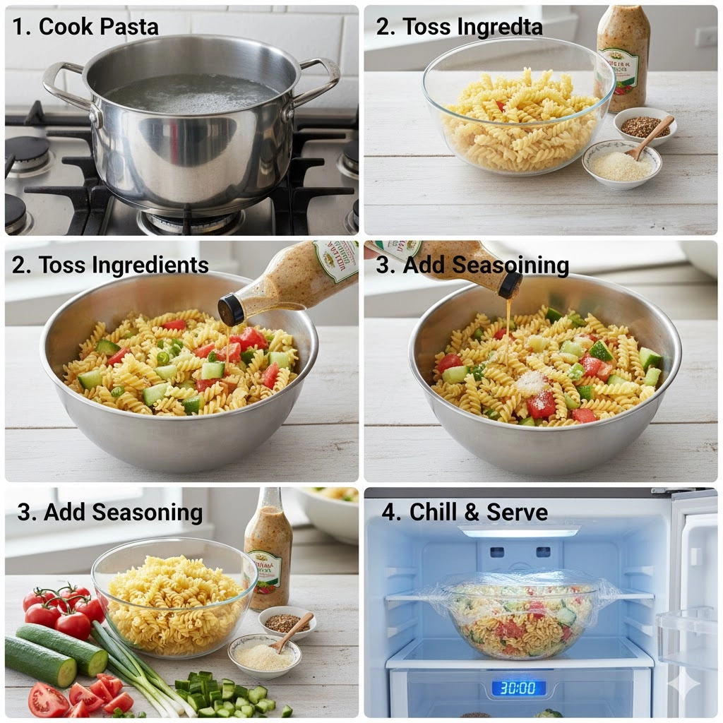 Following these straightforward directions will ensure your salad has the perfect ratio of dressing to pasta and stays fresh for hours.