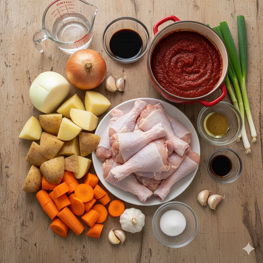 The Gochujang is the soul of this Korean Spicy Chicken and Potato recipe. Because it is a fermented paste, it has a thick, sticky consistency. It is vital to stir the sauce well before the pot heats up. If the paste remains in a clump, it can scorch against the bottom of the pan, creating a bitter, burnt flavor. As the water and soy sauce begin to warm, the paste will dissolve, transforming the clear water into a vibrant, deep crimson broth.