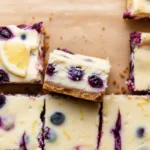 These ultra-creamy lemon blueberry cheesecake bars are baked on a buttery graham cracker crust. They feature fresh lemon flavor, smooth cheesecake, and juicy blueberries.