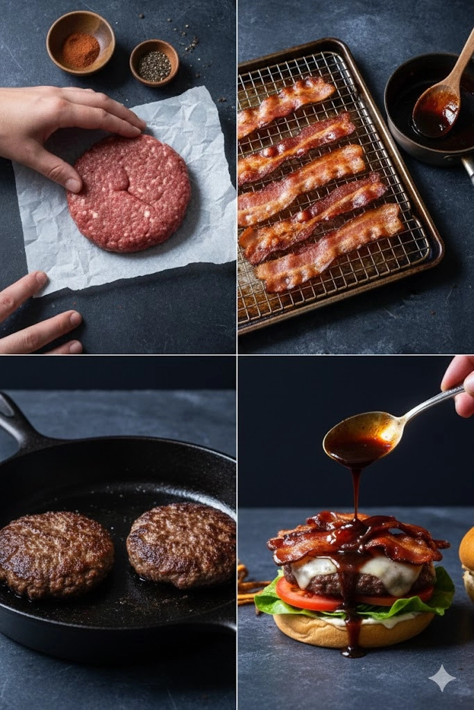 This process is most successful when components are timed correctly. The bacon can be cooked and the glaze reduced while the patties are resting and the grill is heating.