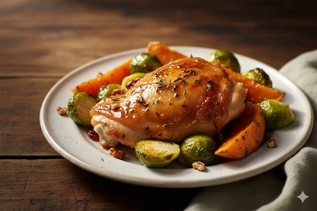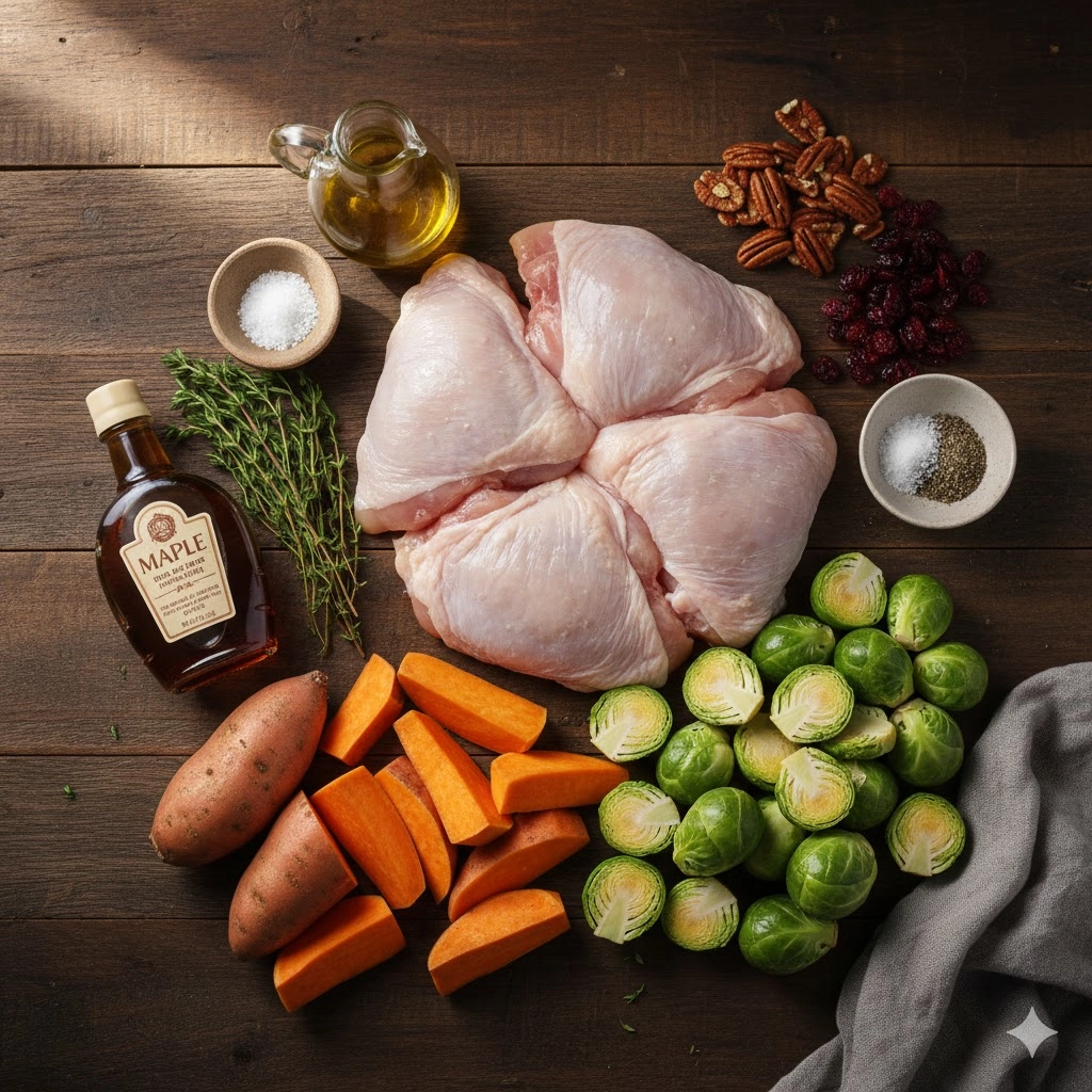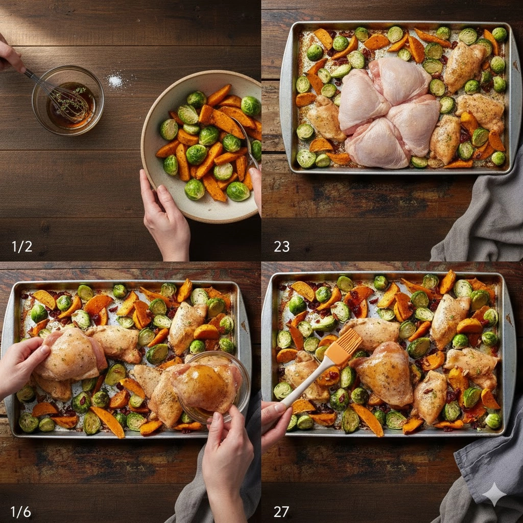 The most common error in tray-style cooking is overcrowding. For the Maple-Roasted Chicken Thighs to reach their full potential, the air must circulate freely around each piece of produce. If the vegetables are stacked, they will release moisture and steam, resulting in a boiled texture rather than a roasted one. You are looking for “maillard reaction” markers—the deep browning of the chicken skin and the dark, caramelized edges of the Brussels sprout leaves.