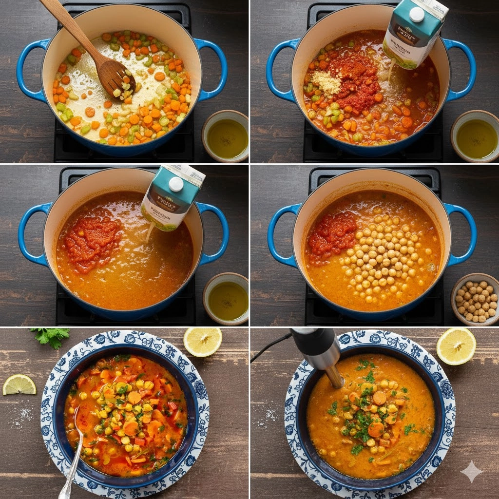 5. Develop the Creaminess: Scoop out one to two cups of the soup and use an immersion blender or standard blender to purée it until smooth. Return this purée to the pot, along with the remaining whole chickpeas.