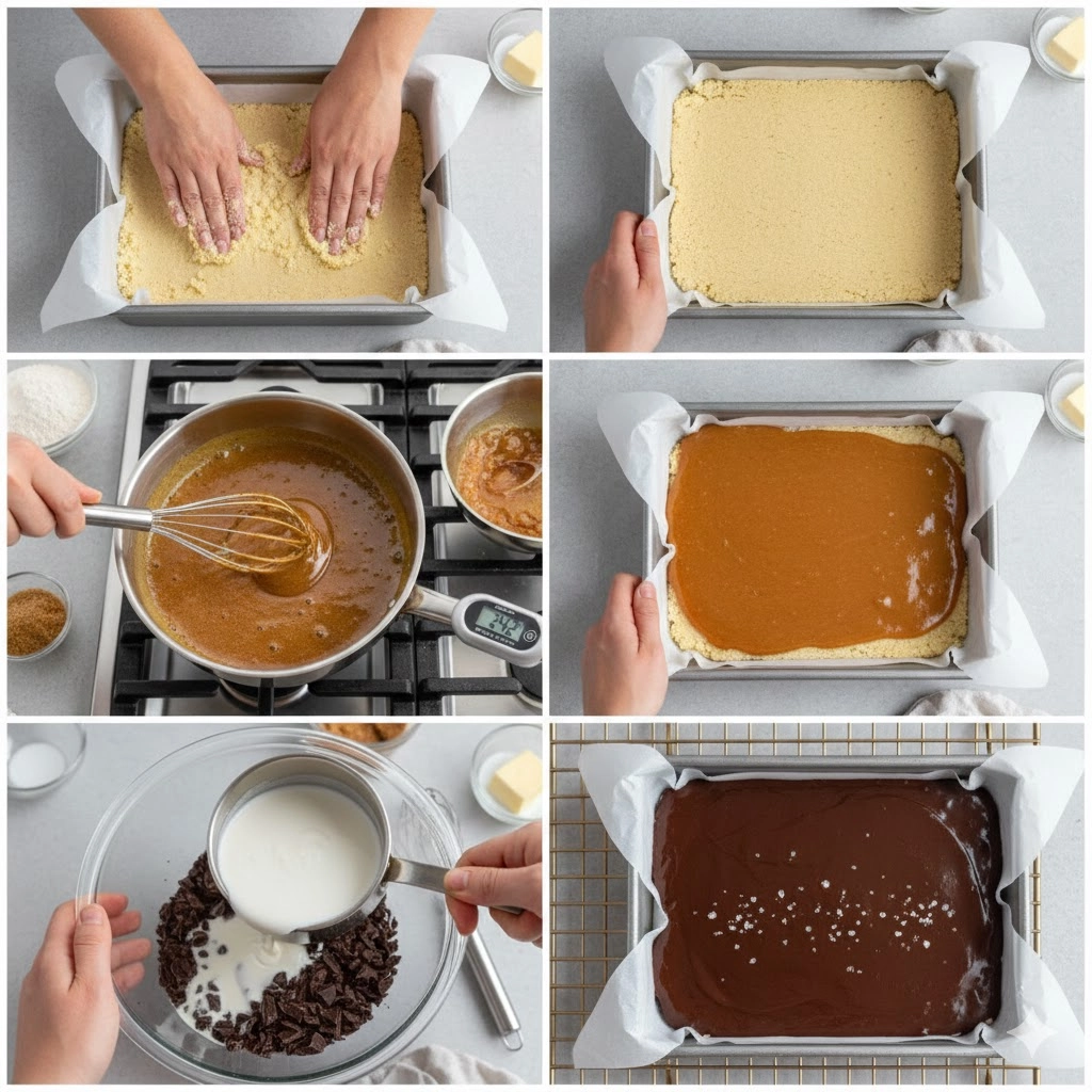 - Apply the Finish: Pour the chocolate ganache over the set caramel layer. Tilt the pan to distribute the chocolate evenly.