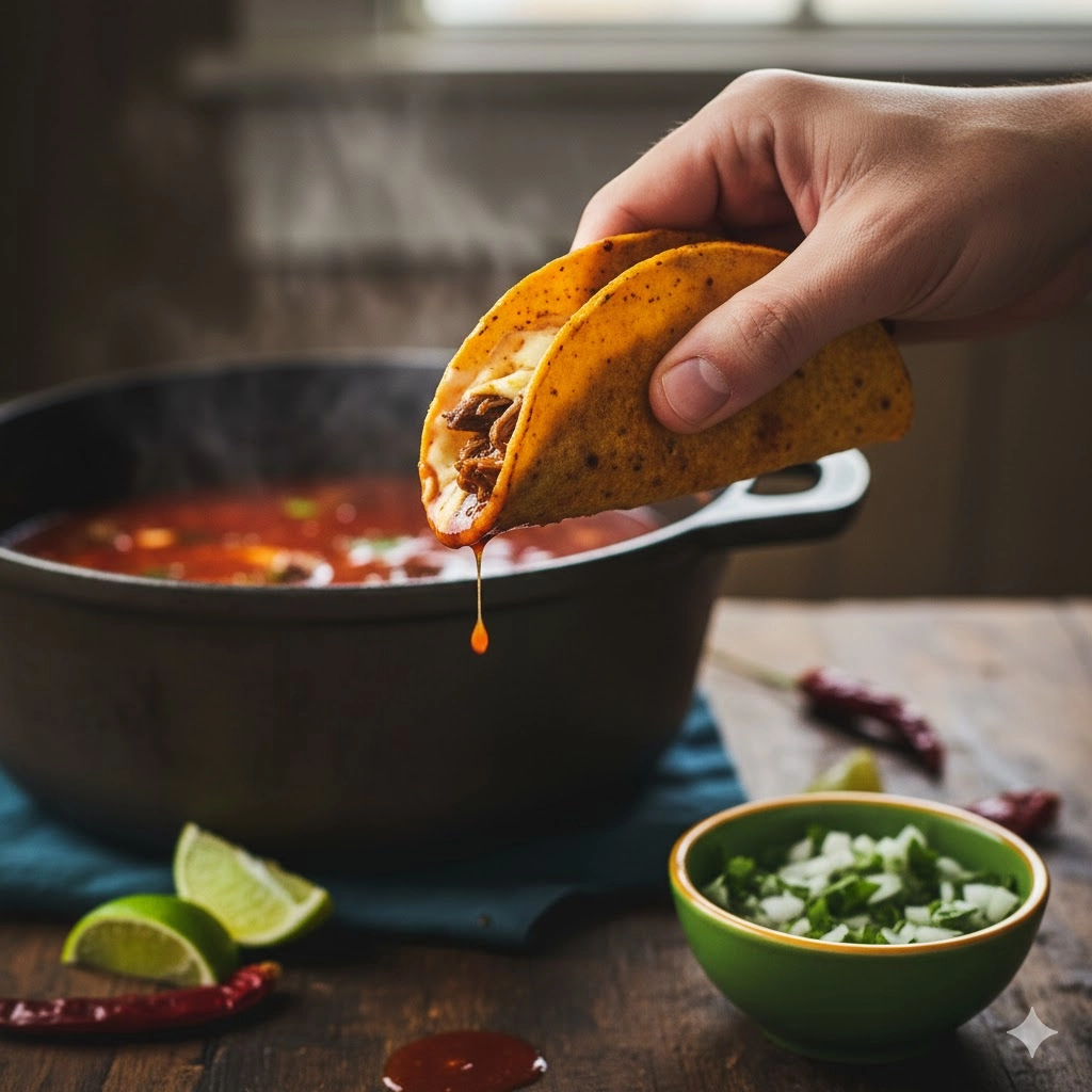 - Garnish and Serve: Garnish the tacos with fresh onion and cilantro, serving them immediately alongside small bowls of the consommé for dipping.