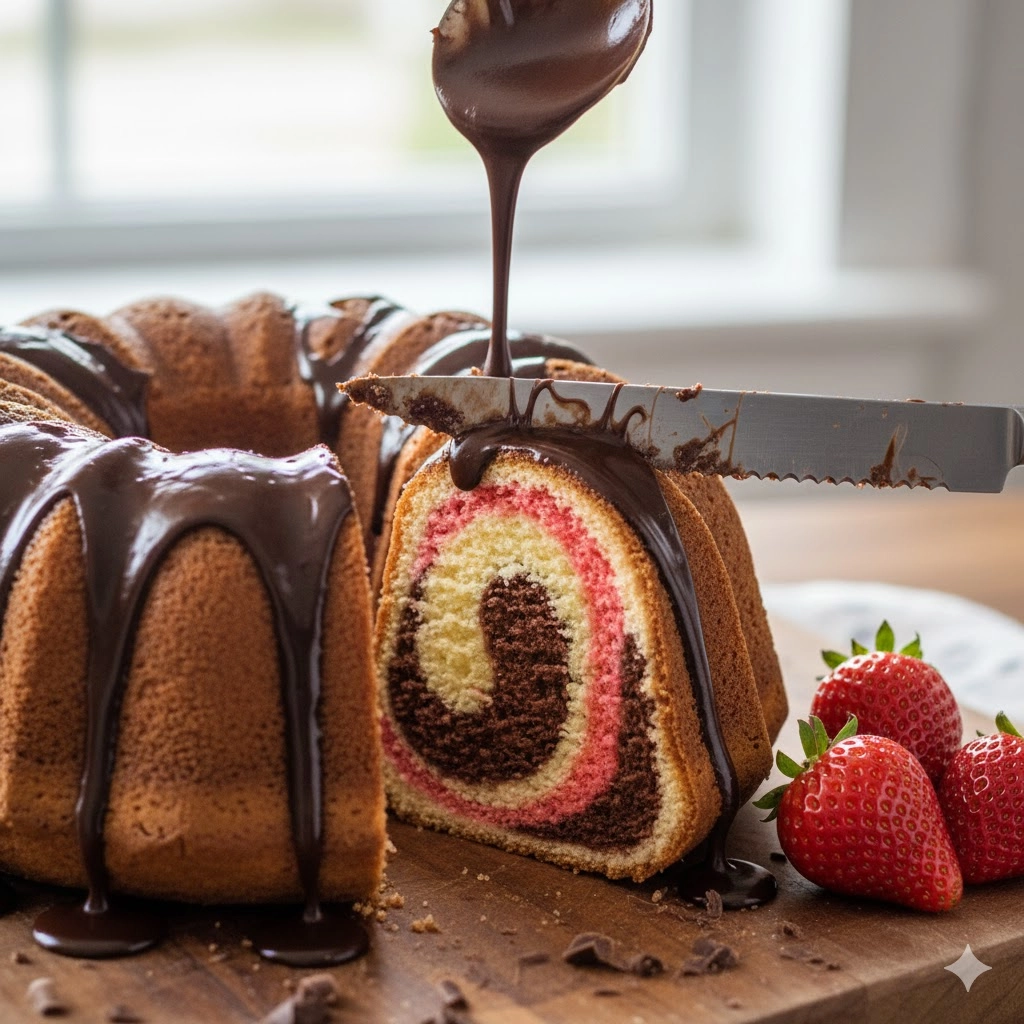 A nostalgic and visually stunning Neapolitan Bundt cake featuring distinct layers of chocolate, strawberry, and vanilla topped with a rich, glossy chocolate syrup glaze.
