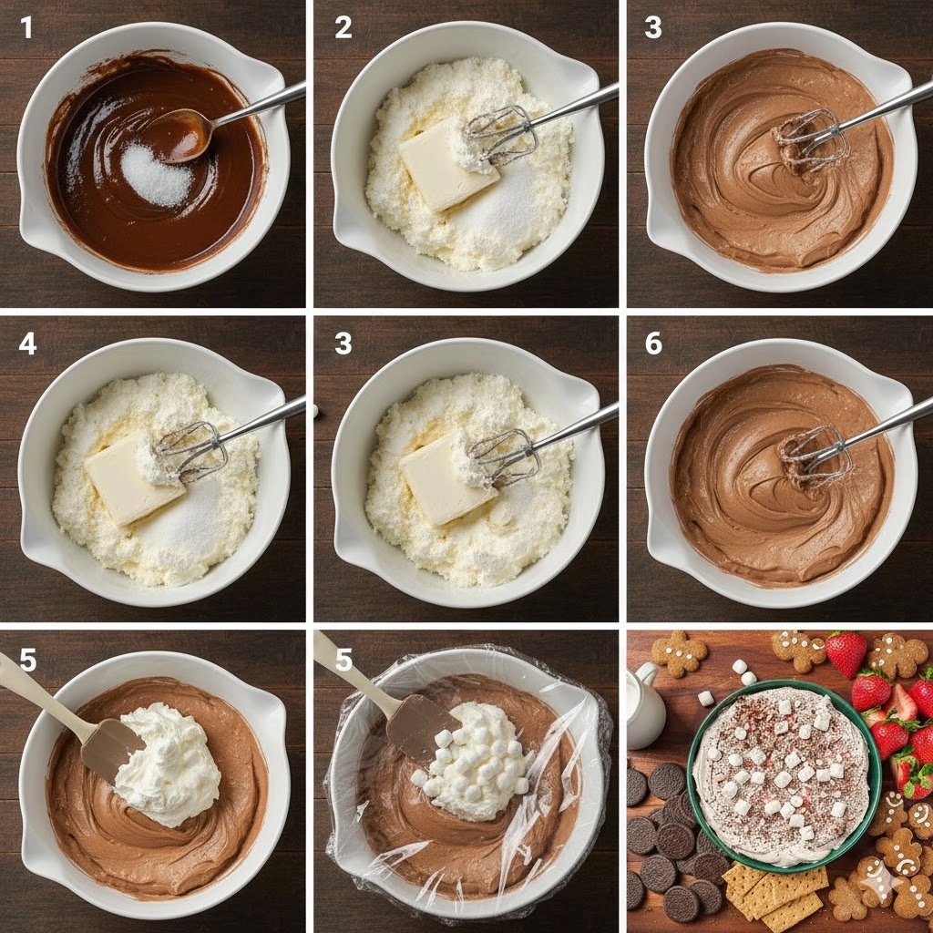 - Finish and Chill: Stir in half of the mini marshmallows. Transfer the dip to your serving bowl, cover it tightly, and chill in the refrigerator for at least two hours before serving.
