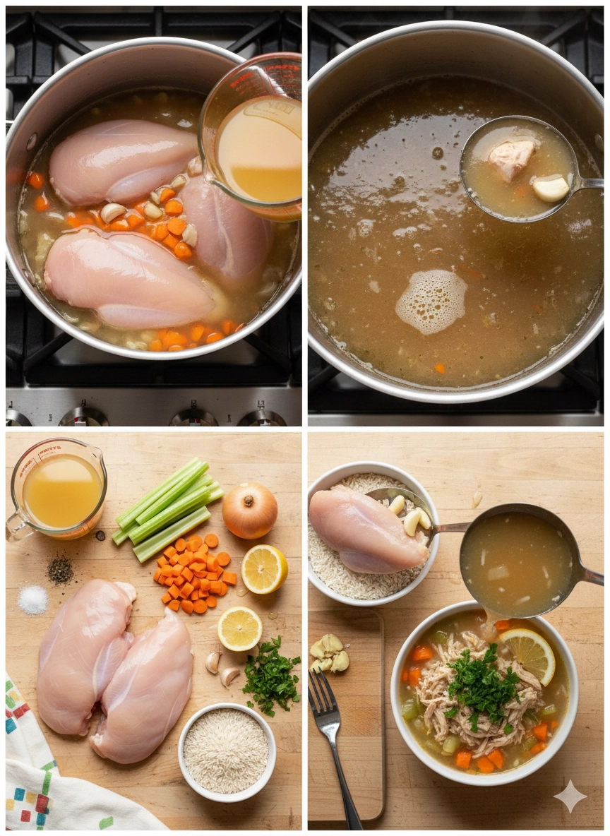 Follow these straightforward steps to achieve a perfectly balanced soup that features tender grains and succulent, shredded poultry.