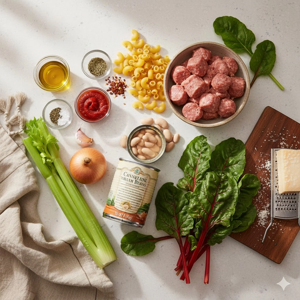 This Pasta Fazool (Pasta e Fagioli) is a rich, hearty Italian-American classic. Featuring savory sweet Italian sausage, creamy cannellini beans, and tender Swiss chard, it is the ultimate bowl of comfort food.