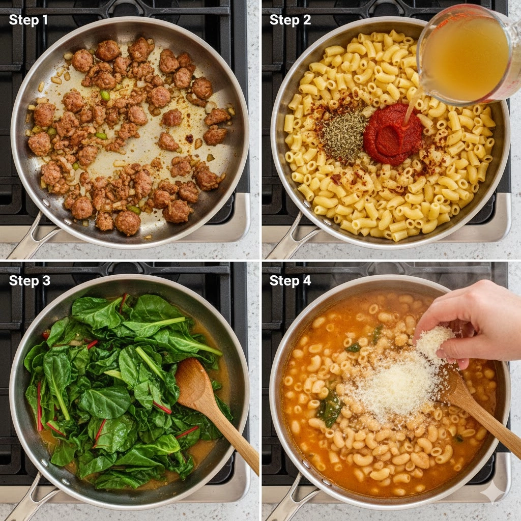 - Begin by prepping your workspace and gathering all measured ingredients. Place a large skillet or Dutch oven over medium-high heat and add the olive oil. Once the oil shimmers, add the sweet bulk Italian sausage. Use a wooden spoon to break the meat apart, cooking and stirring until it is beautifully browned and crumbly, which should take approximately 5 minutes.