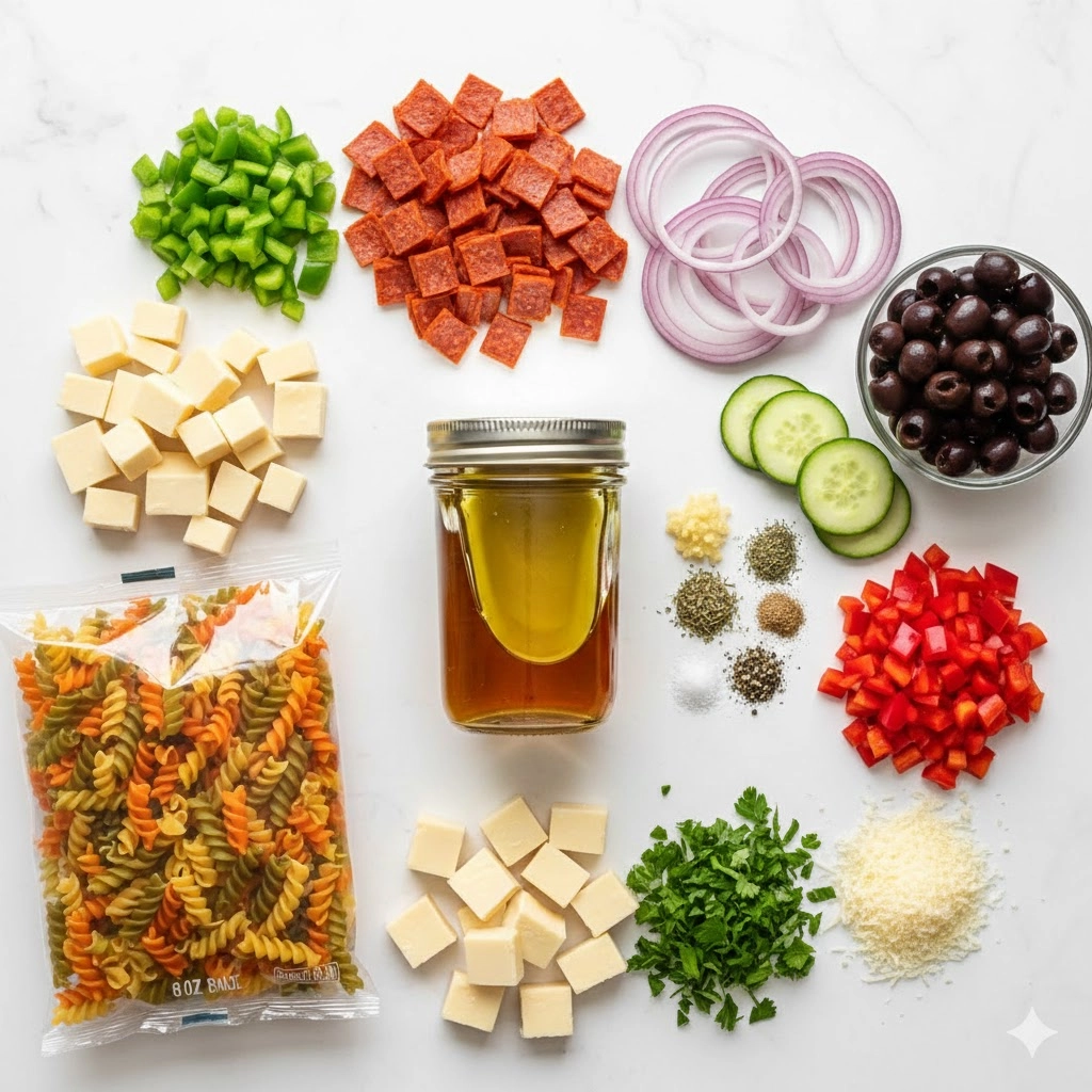 This vibrant Pasta Salad with Homemade Dressing is the ultimate crowd-pleaser. Loaded with tri-color rotini, pepperoni, provolone, and fresh veggies, it is tied together by a zesty, handcrafted Italian vinaigrette.