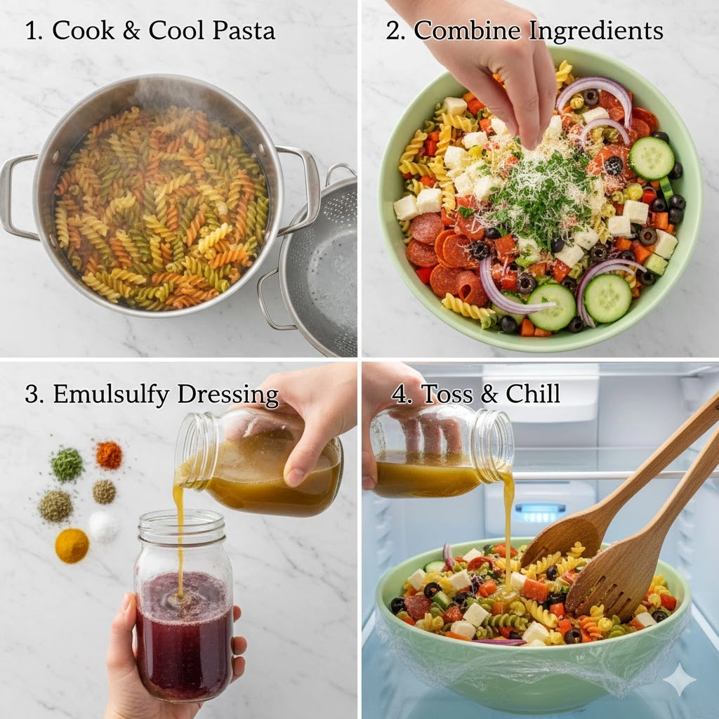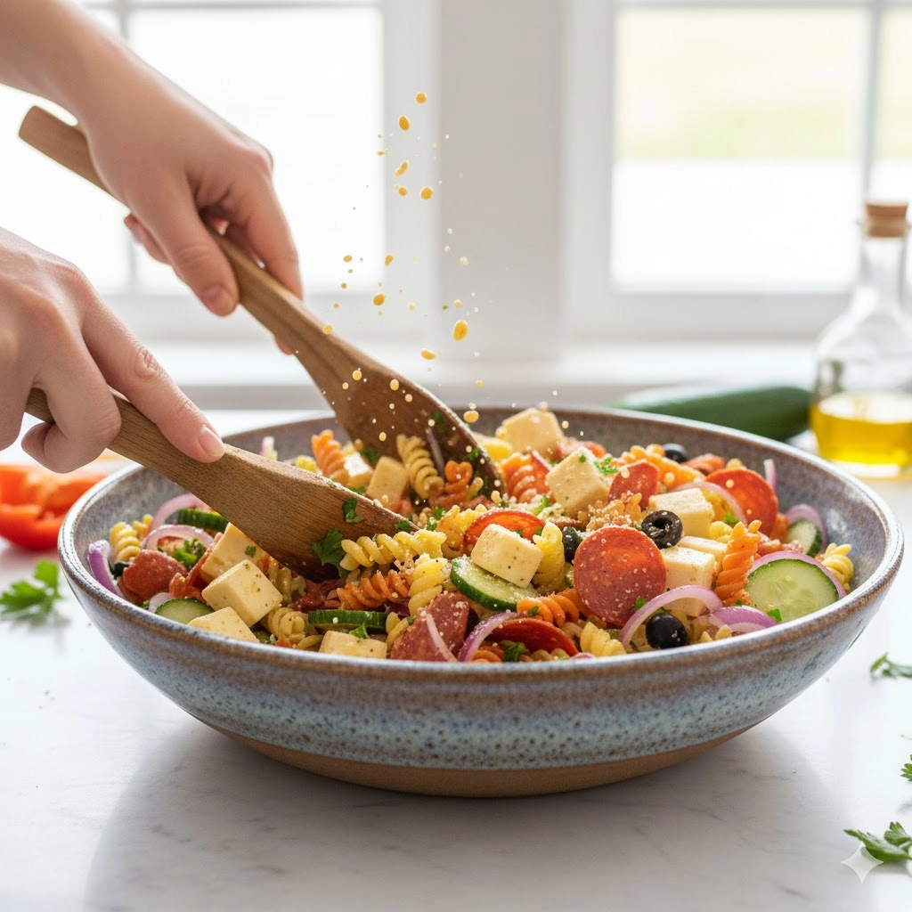 - The Final Marriage of Flavors: Drizzle the homemade dressing over the pasta and vegetable mixture. Use a large spoon or salad tongs to toss the ingredients thoroughly, ensuring the dressing penetrates the spirals of the rotini.