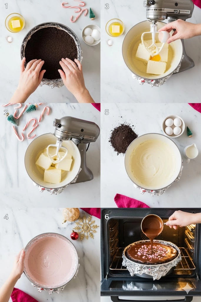 1. Prep the Pan and Crust: Preheat your oven to three hundred twenty-five Fahrenheit. Wrap the exterior of a 9-inch springform pan tightly in heavy-duty aluminum foil. Mix the crust ingredients and press firmly into the bottom. Bake for ten minutes.