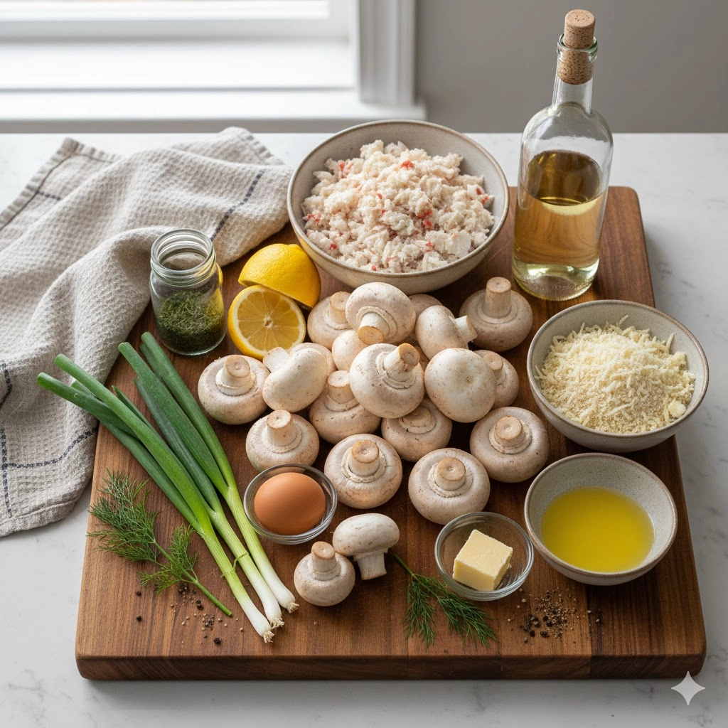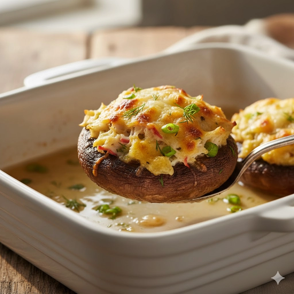 - Spoon a generous amount of the crab mixture into each mushroom cavity.