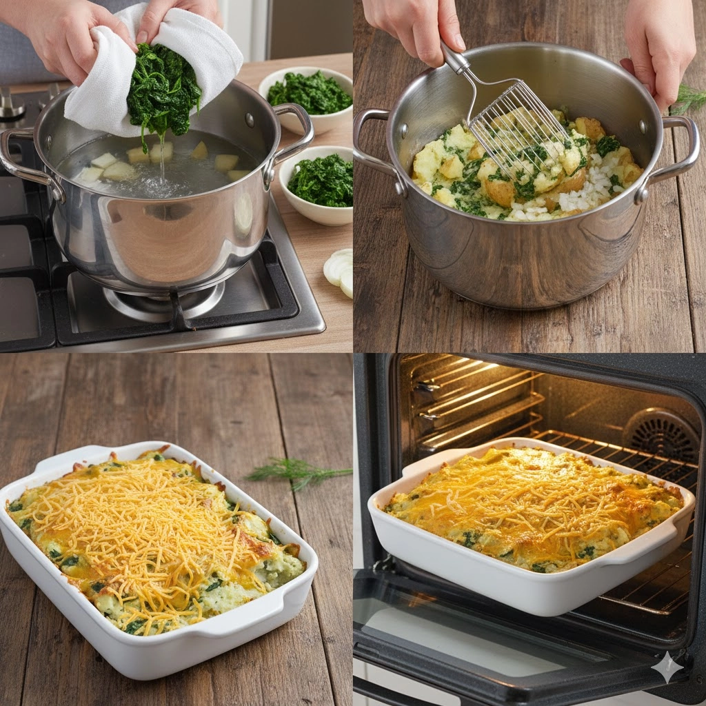 This heritage recipe transforms classic mashed potatoes into a vibrant, cheesy casserole using frozen spinach, sour cream, and a hint of dill. A perfect family side dish that is both comforting and nutrient-dense.