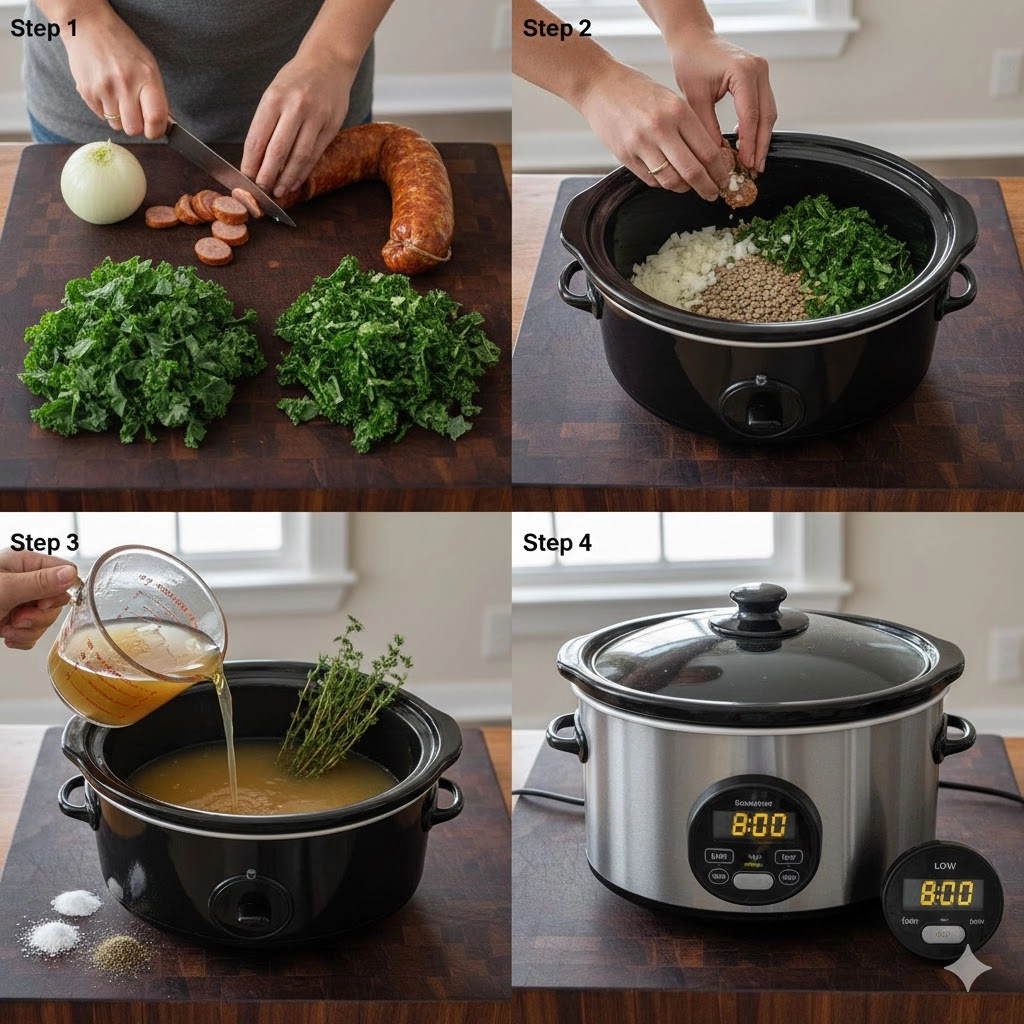 - In a 6-quart or larger slow cooker, combine the dried French lentils, the sliced sausage, the chopped kale, the diced onion, and the minced garlic.
